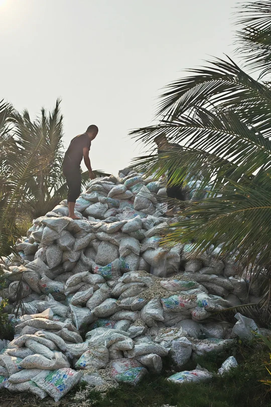 抵达的那天,海风轻柔地吹着。审判团队成员与琼海市综合行政执法局、琼海市公安机关的工作人员一同监督、见证并参与了这场特殊的“生态归乡”之旅——从正午时分至暮色四合,一袋袋珊瑚石从货车上卸下,束缚了它们三年的编织袋被一一剖开,获得自由的珊瑚石轻松愉快地回到它们的原生海滩,重新融入熟悉的海洋生态链。海风轻拂,潮水涌来,声声浪响,仿佛是大海在诉说着司法修复的强大力量。这一刻,所有的奔波与坚持有了现实的意义。