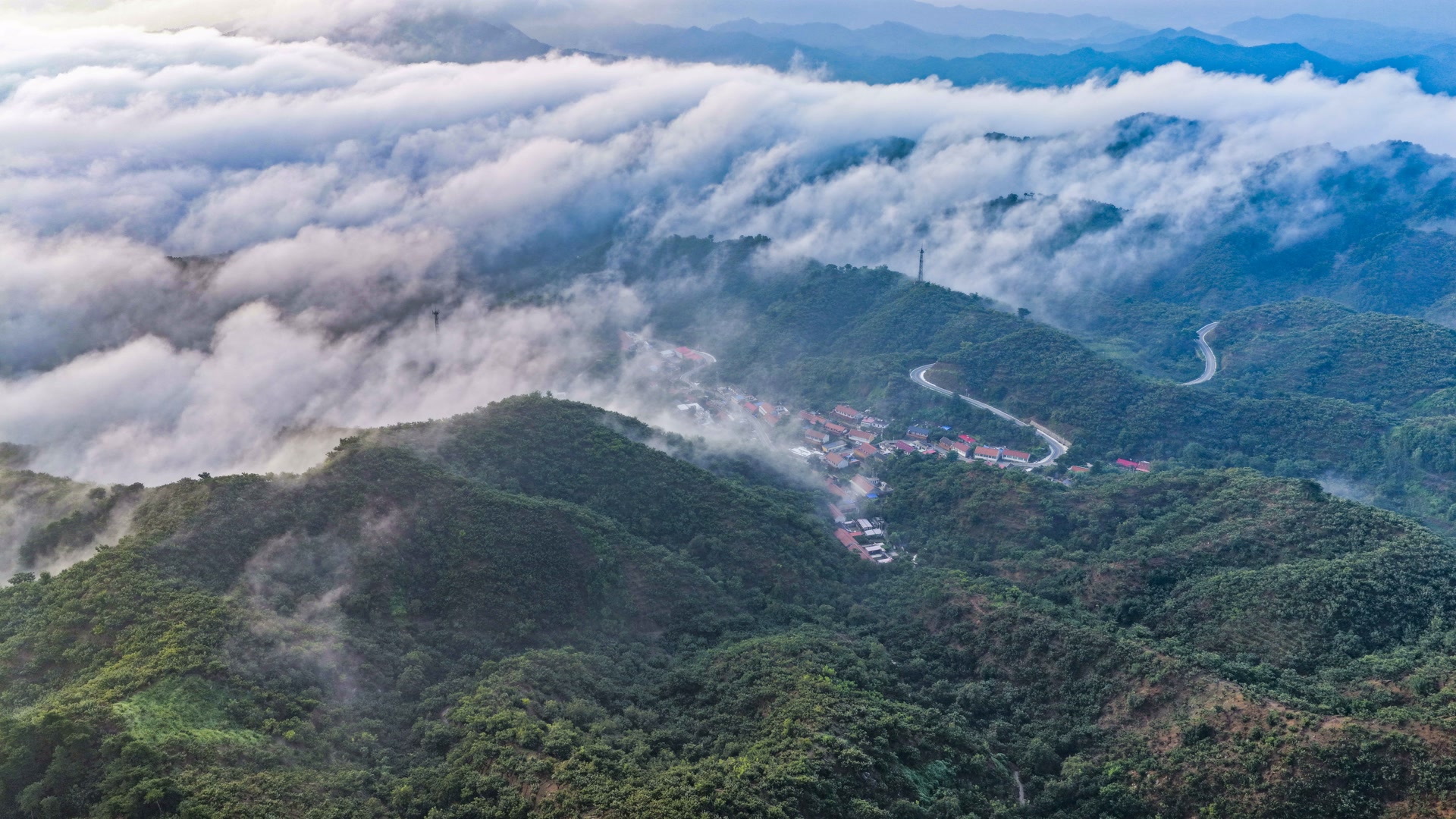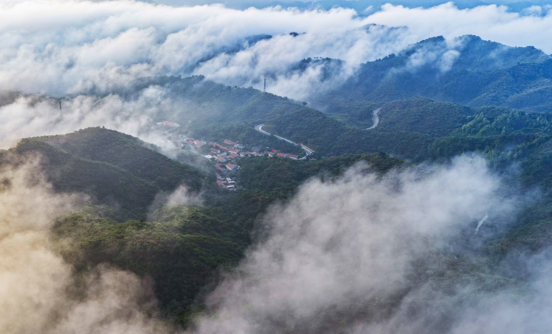 8月18日,位于河北省遵化市北部的燕山山脉出现壮美云海。绿树掩映的村庄、弯弯的道路、鳞次栉比的山峰等交相辉映,壮美如画。