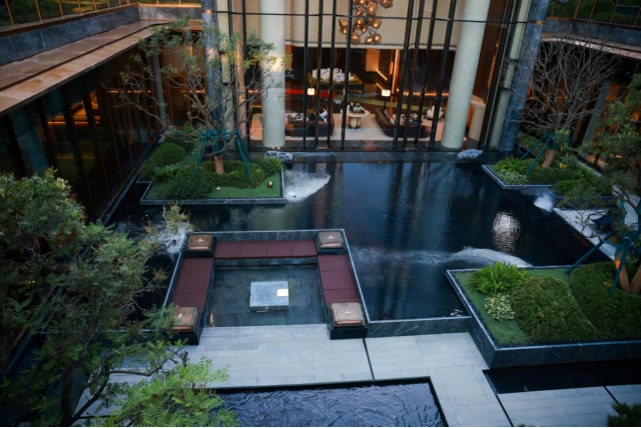 内院进深约23米,以置石、流水、造型元宝枫树营造山水意趣,巴马哈蓝石材经过人工拉槽打磨,打造6米高悬叠瀑。500平方米下沉庭院灵感来源于《千里江山图》所描绘的“九鲤飞瀑”,6米高差营造立体山水。