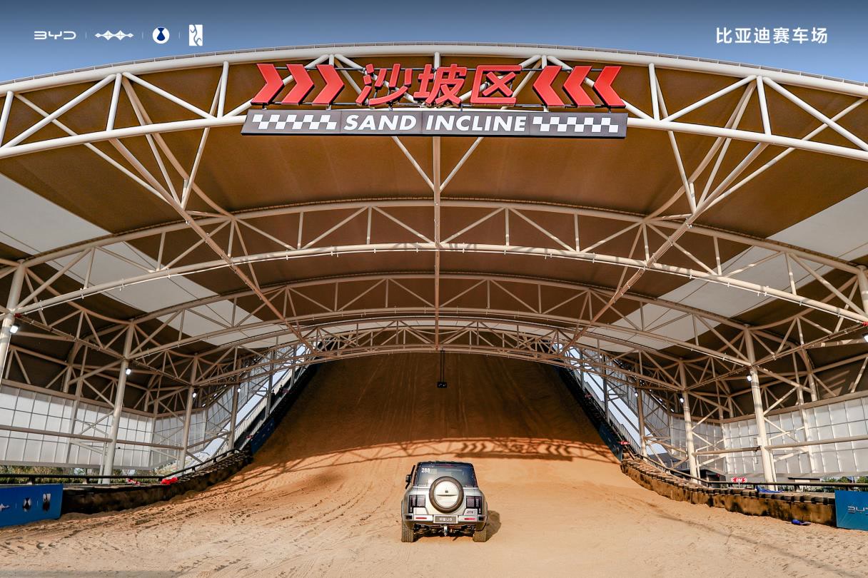 不同于传统赛车场的单一设计,比亚迪将国内特色地形“搬进”赛车场。悬天沙坡区以29.6米垂直高度和28度冲坡落差斩获两项吉尼斯纪录,用户无需前往内蒙古阿拉善即可体验冲沙乐趣;浮水航行池专为仰望U8打造,70米长的透明水池直观展示易四方技术如何实现水中直行与转向,重新定义极端环境安全标准。