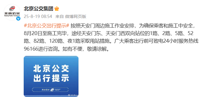 按照天安门周边施工作业安排,为确保乘客和施工中安全,8月20日至施工完毕,途经天安门东、天安门西双向站位的1路、2路、5路、52路、82路、120路、夜1路采取甩站措施。