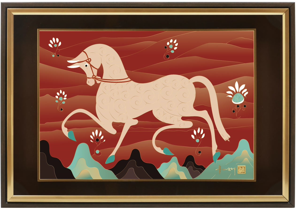 为喜迎2026年生肖马年,金丝琅彩画《金马送福》以常沙娜先生临摹敦煌莫高窟北魏257窟壁画《挽车白马》为设计蓝本,采用中国传统工艺+当代技艺融合打造的。作品经设计、金属制版、起色、金属压制、调色、上色、固色、钤印,历经十几道工序,色彩沉稳,颇具敦煌韵味。