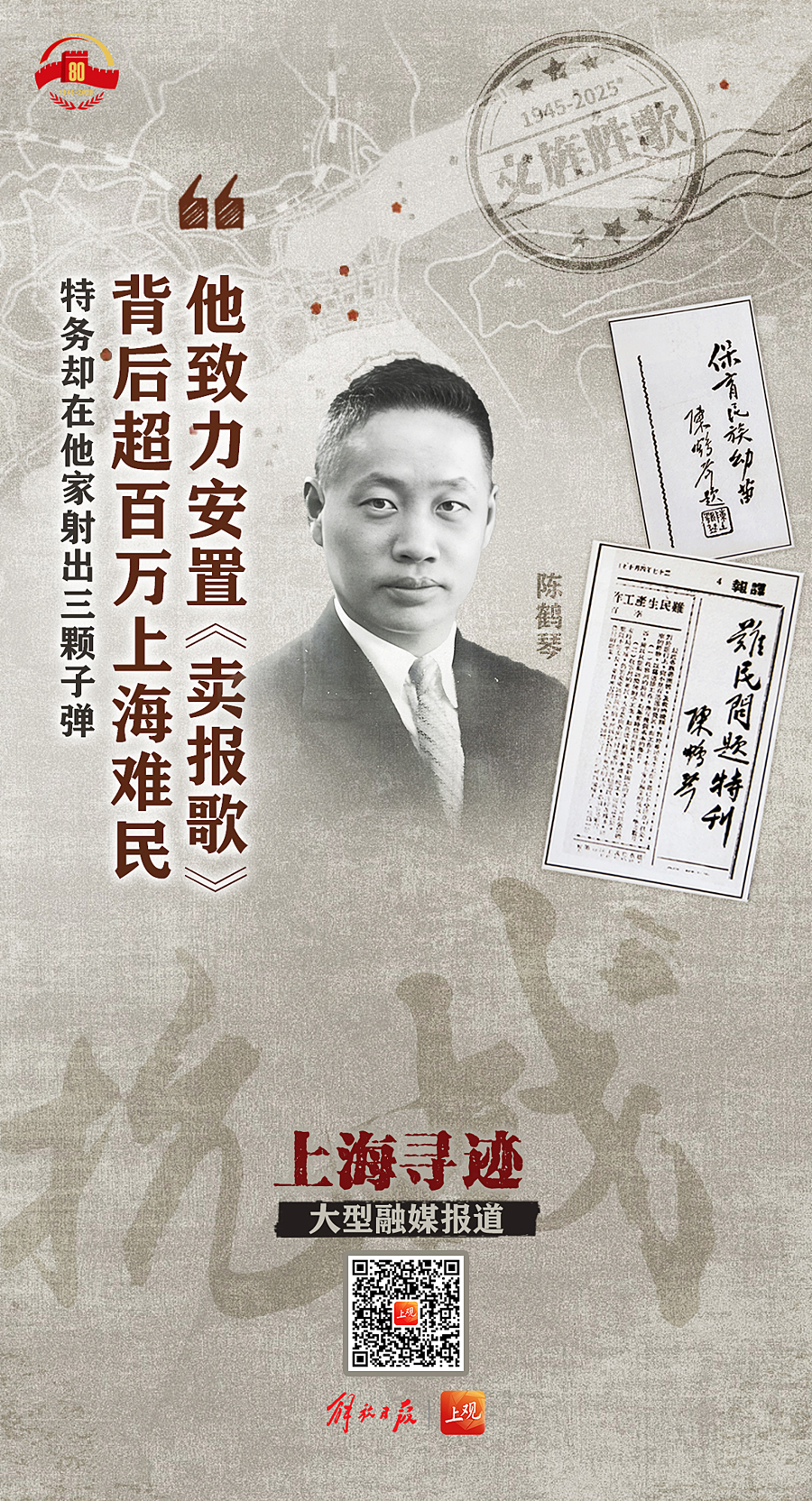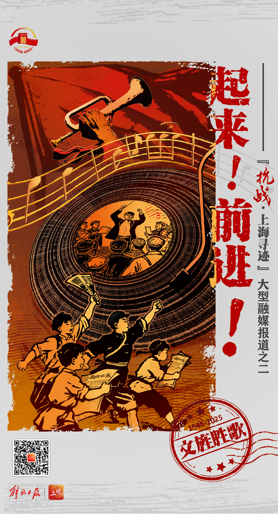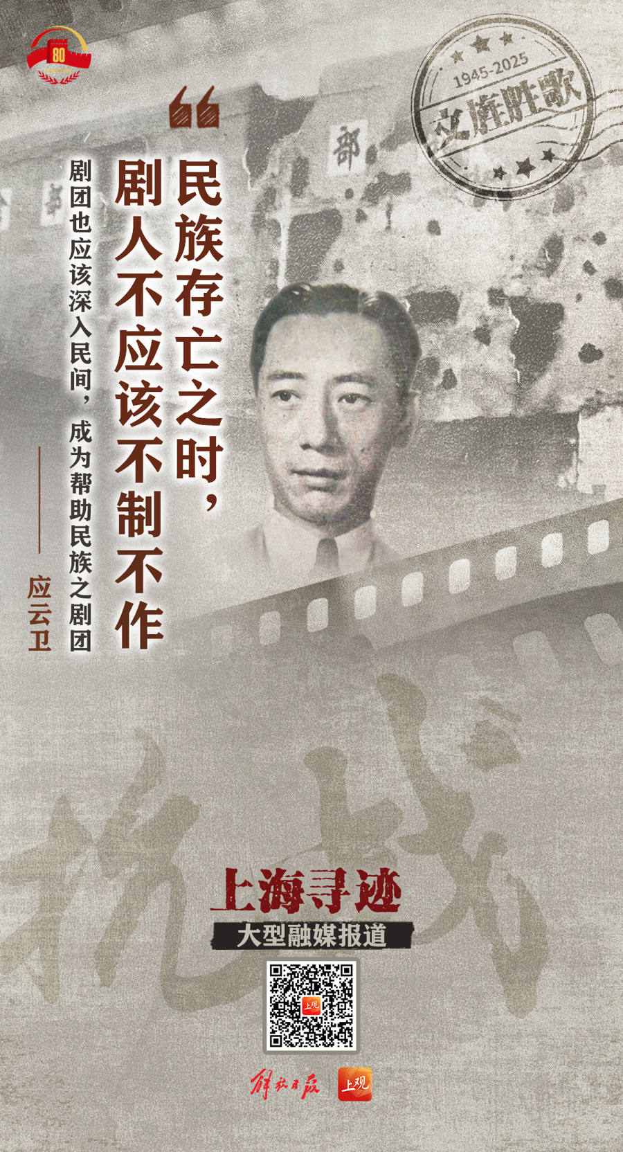 我们选取发生在上海那些影响深远、意义非凡的重大文化事件、重要文艺作品、文人志士的身影等作为视觉元素,精心制作了一系列海报,通过一幅幅令人壮怀激烈又回味无穷的画面,回望抗战共识凝聚,致敬文人志士义举,弘扬伟大抗战精神。