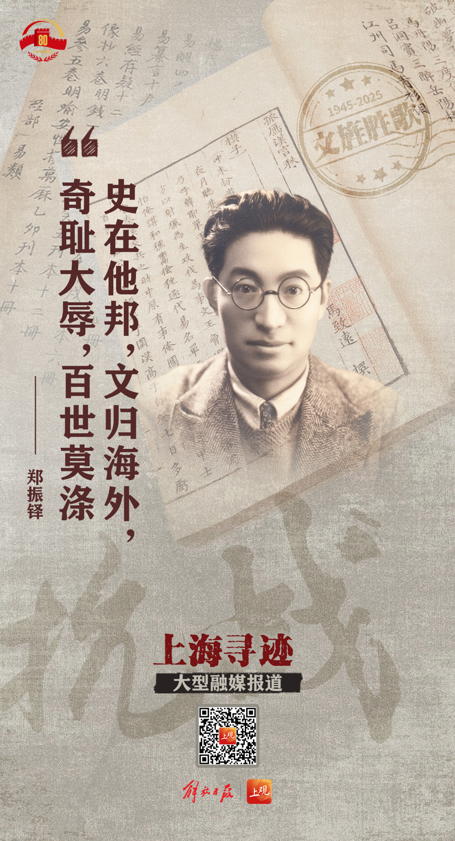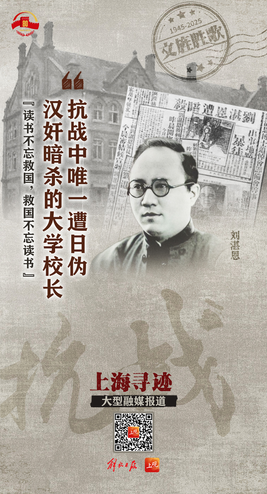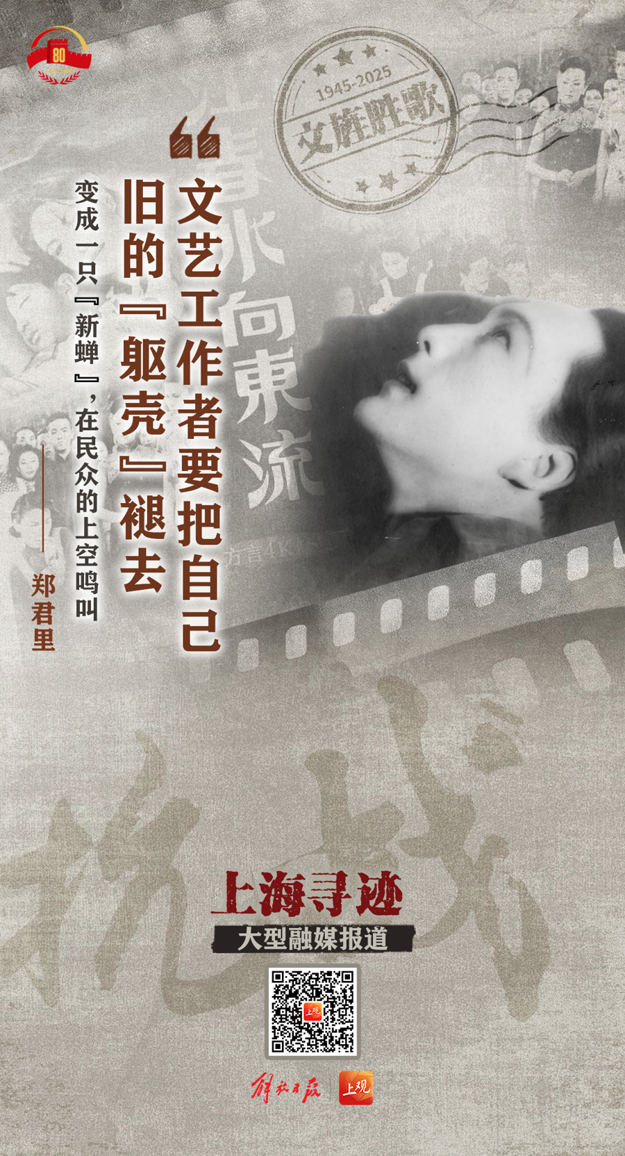 我们选取发生在上海那些影响深远、意义非凡的重大文化事件、重要文艺作品、文人志士的身影等作为视觉元素,精心制作了一系列海报,通过一幅幅令人壮怀激烈又回味无穷的画面,回望抗战共识凝聚,致敬文人志士义举,弘扬伟大抗战精神。