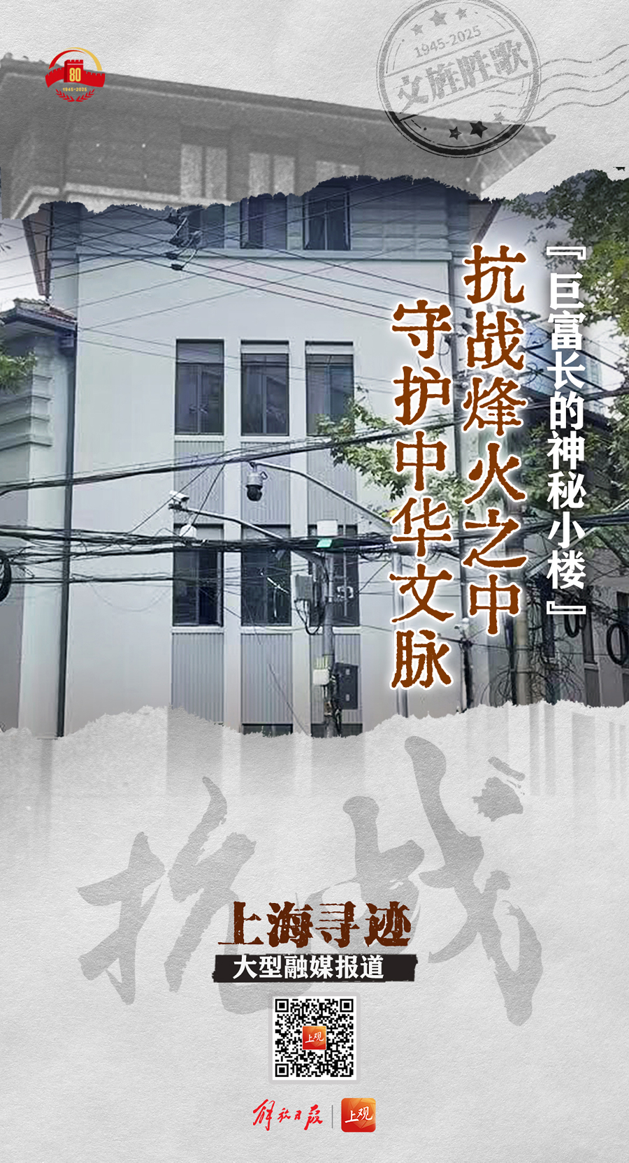 我们重回当年不见硝烟却依然震撼人心的战斗现场,寻找那些鼓舞人心的文艺作品诞生之处,访问文化名人抗战期间在上海奔走的人生轨迹,回望上海民众在民族危亡之时万众一心的觉醒。抗日战争的胜利,是民族精神的伟大胜利。而民族精神,必将照亮我们未来的征程。