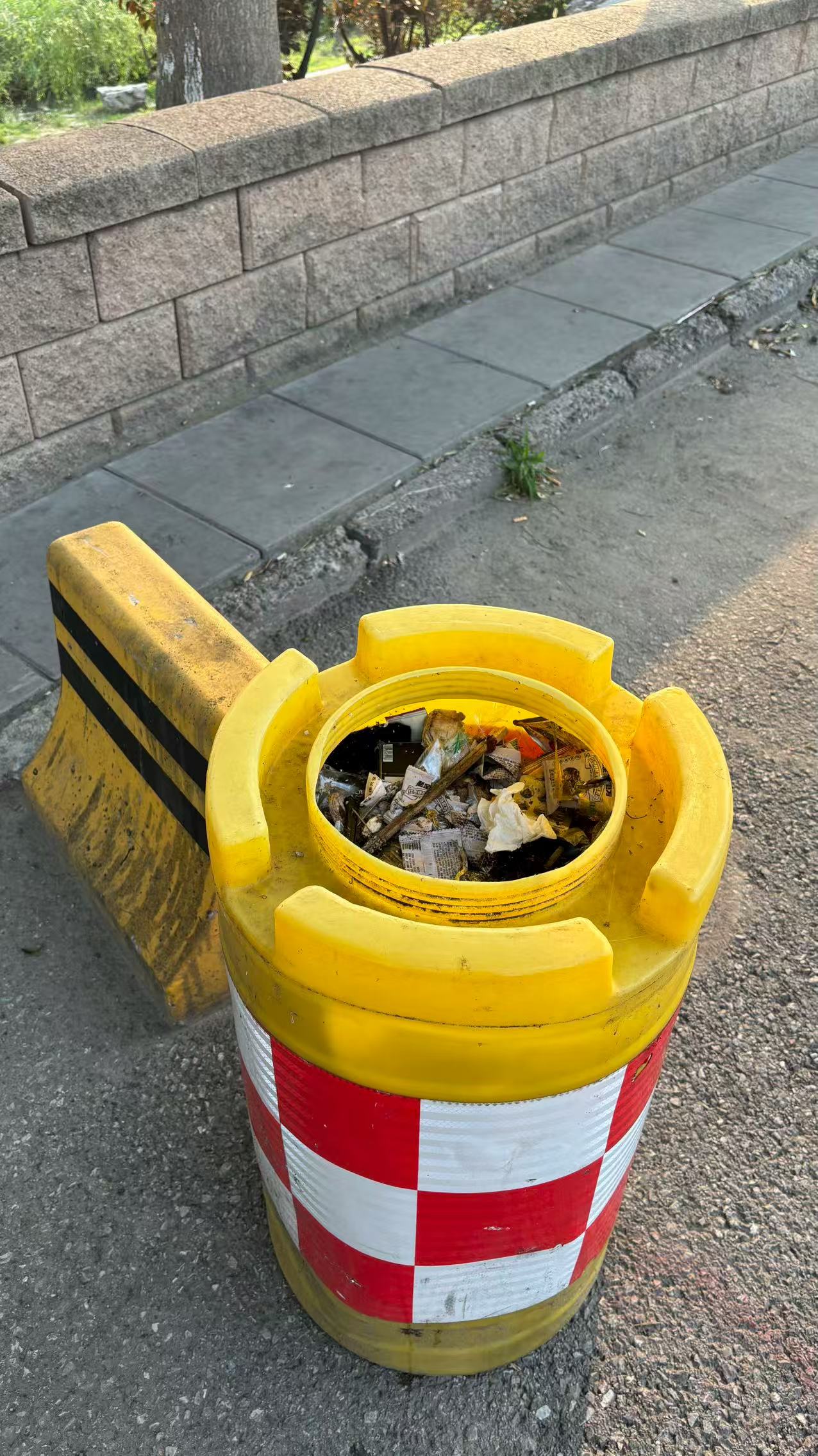 或许是附近缺乏垃圾桶的缘故,百米外的空地上,摆放着几个交通圆柱桶,被人们扔了各式各样纸巾、包装袋、果皮果核……望向桶内,垃圾已经装得满满当当!