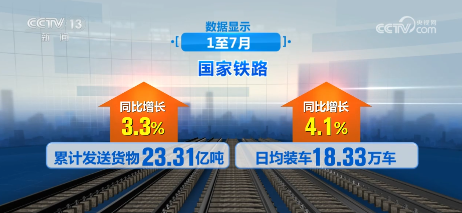 数据显示,1至7月,国家铁路累计发送货物23.31亿吨、日均装车18.33万车,同比分别增长3.3%、4.1%。