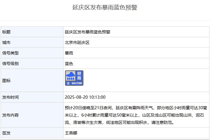 预计20日傍晚至21日夜间,延庆区有雷阵雨天气,部分地区小时雨量可达30毫米以上,6小时累计雨量可达50毫米以上,山区及浅山区可能出现山洪、泥石流、滑坡等次生灾害,低洼地区可能出现积水,请注意防范。
