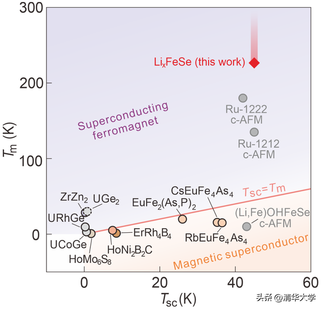 图2.超导与铁磁共存的材料体系。红色菱形代表本工作中报道的高温超导铁磁体