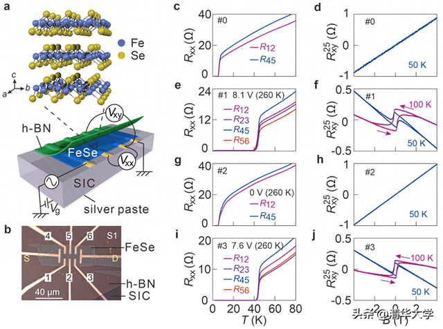 图1.样品器件示意图以及电场调控下无磁低温超导态与高温超导铁磁态间的来回切换