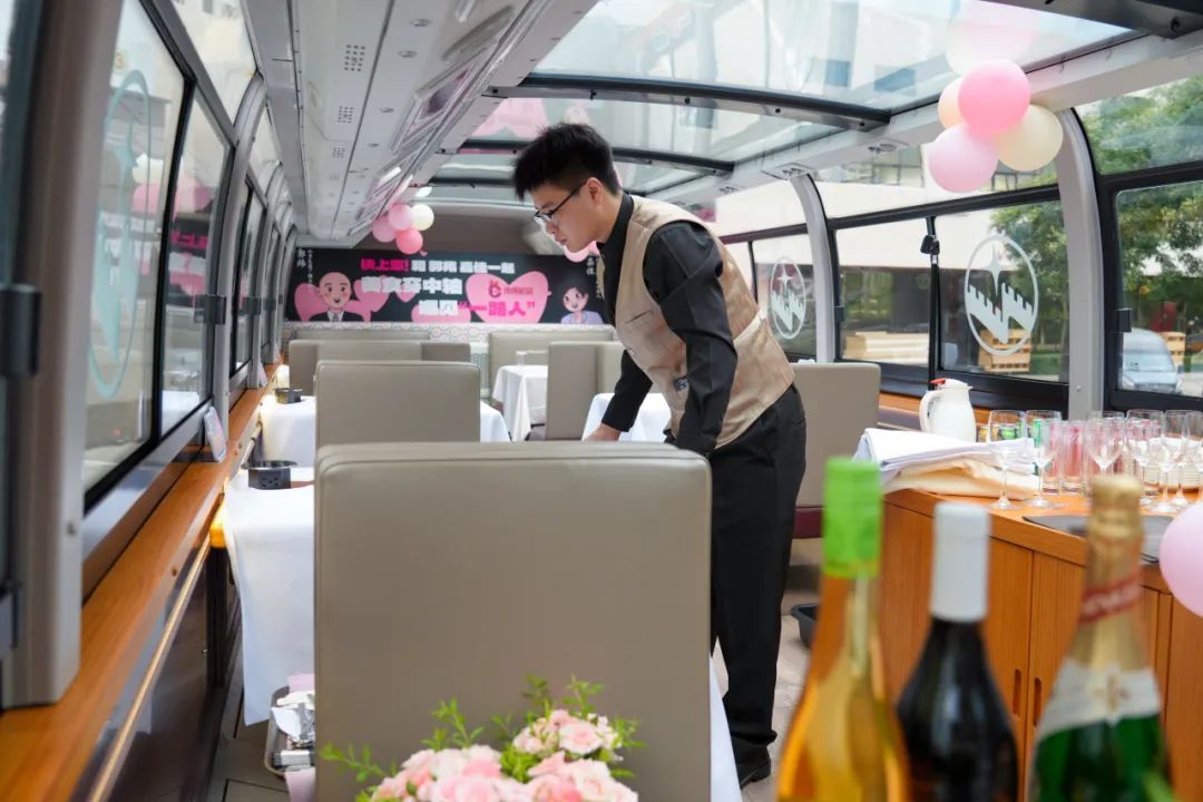 巴士一层是多功能服务区,设有红酒柜、冰箱、卫生间、洗手池和厨师操作区等设施,满足了乘客的多样化需求。二层是就餐区,精心摆放8张纯实木餐桌(包括4张单人桌和4张双人桌),和24个高品质座位,确保每位游客都能享受到舒适的用餐空间。最引人注目的亮点是车辆顶层的全景360度天窗,这在国内尚属创新,经过特别改良的全景天窗提供了广阔视野,使游客在品味精致美食的同时,能够尽情欣赏城市的美景。