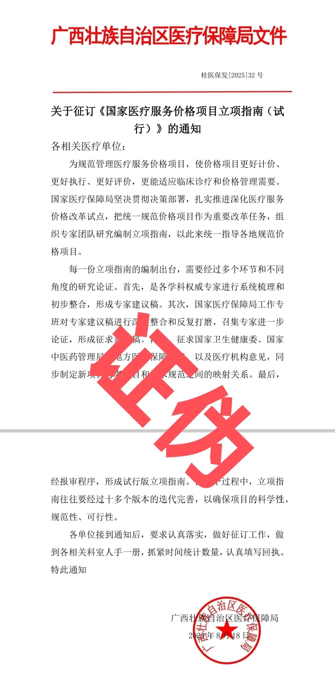 近日,网络上有流传一份以我局名义制发的《关于征订〈国家医疗服务价格项目立项指南(试行)〉的通知》。经核实,该文件非我局制发,系不明人员伪造,内容相关信息均不属实。请有关单位、医疗机构、企业和广大群众提高警惕、加强甄别,谨防上当受骗。相关信息均以广西壮族自治区医疗保障局官方发布渠道为准。