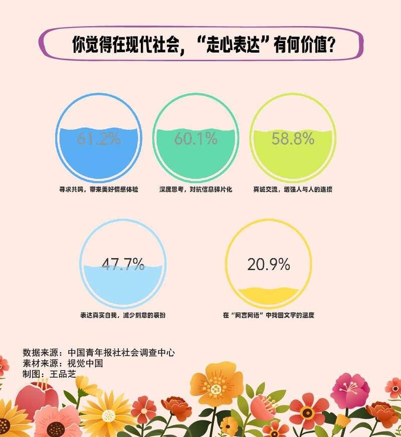 在现代社会,“走心表达”有何价值?调查中,61.2%的受访者认为可以寻求共鸣,带来美好情感体验;60.1%的受访者认为有利于深度思考,对抗信息碎片化带来的空虚感;58.8%的受访者认为可以增强人与人的连接;47.7%的受访者认为有助于表达真实自我,减少刻意的装扮;20.9%的受访者觉得可以在“网言网语”中找回文字的温度。