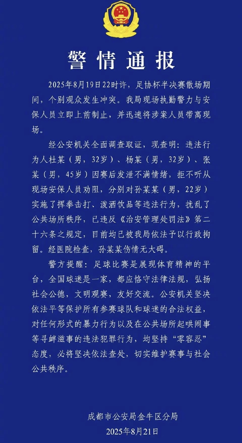 8月21日,成都市公安局金牛区分局发布警情通报: 2025年8月19日22时许,足协杯半决赛散场期间,个别观众发生冲突。我局现场执勤警力与安保人员立即上前制止,并迅速将涉案人员带离现场。