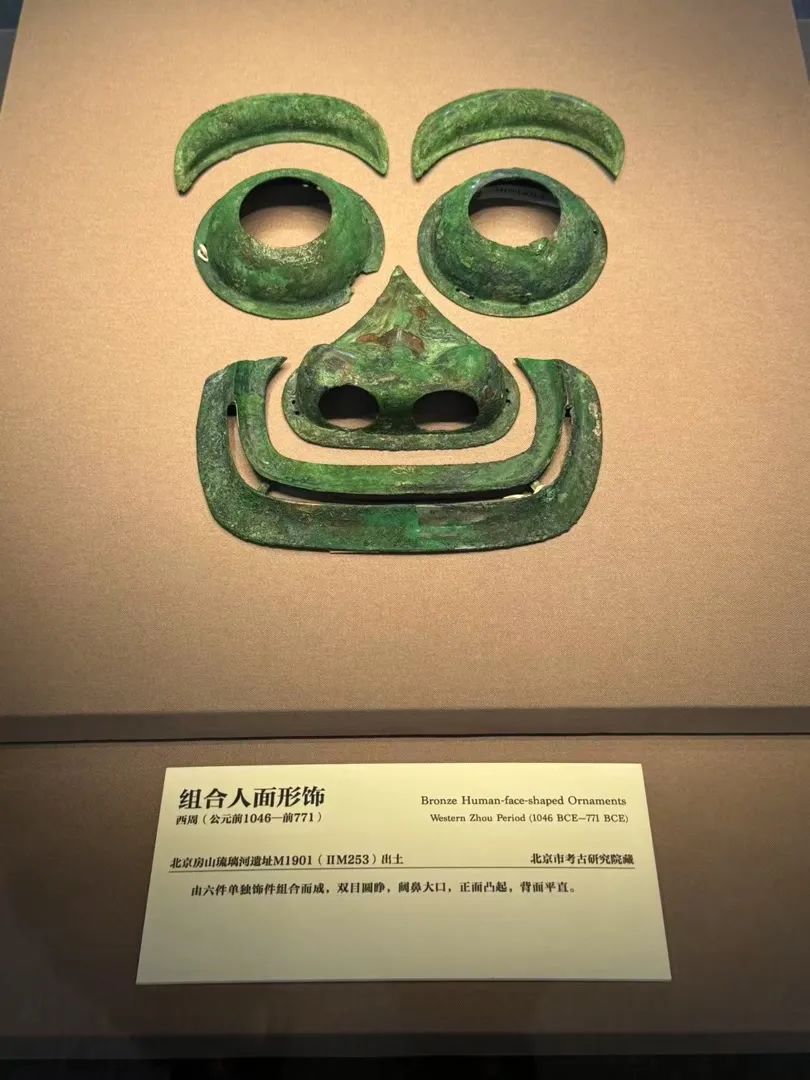 除了作册奂器、堇鼎、伯矩鬲,本次展览还展出了克盉、克罍、圉簋、伯鱼簋等重磅文物。记者在现场还发现了三件颇有“网红”潜力的青铜面具。其中,最大的那件青铜面具由6个零件组合而成,双目圆睁、阔鼻大口、嘴角上扬,像是位浓眉大眼的“喜剧演员”。