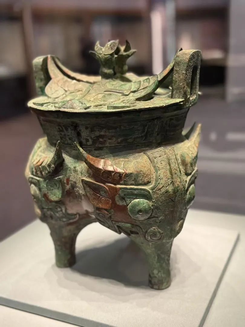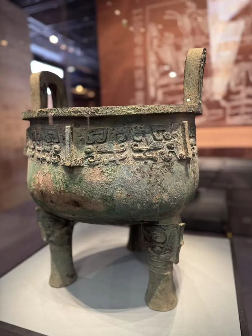 这次展览,被誉为“鼎天鬲地”组合的国宝级文物堇鼎、伯矩鬲,实现了“合璧”展出。参观完“双重城垣”复原图,再往展厅里面走就能看到它们。