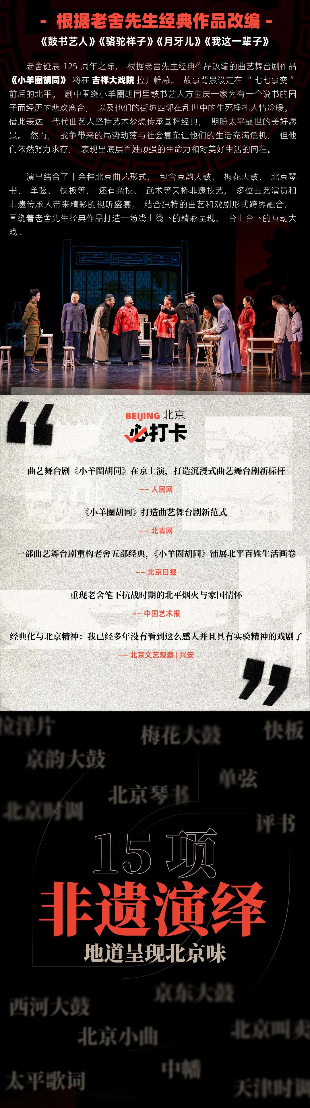《小羊圈胡同》是根据老舍先生《鼓书艺人》《月牙儿》《我这一辈子》《骆驼祥子》和《断魂枪》这五部小说改编的曲艺舞台剧。故事背景设定在“七七事变”前后的北平。剧中讲述了小羊圈胡同里鼓书艺人方宝庆一家为拥有一个说书园子而经历的悲欢离合,以及街坊四邻在乱世中的生死挣扎与人情冷暖,展现一代代曲艺人坚持艺术梦想、传承国粹经典、期盼太平盛世的美好愿景。