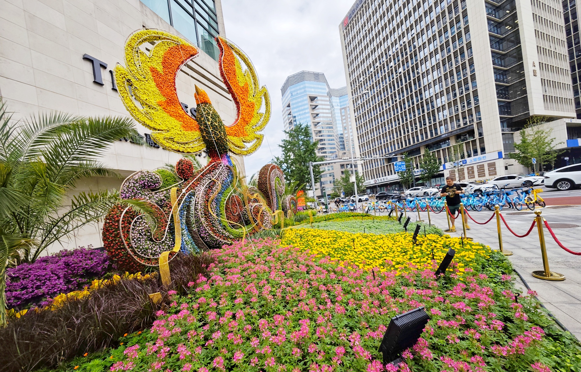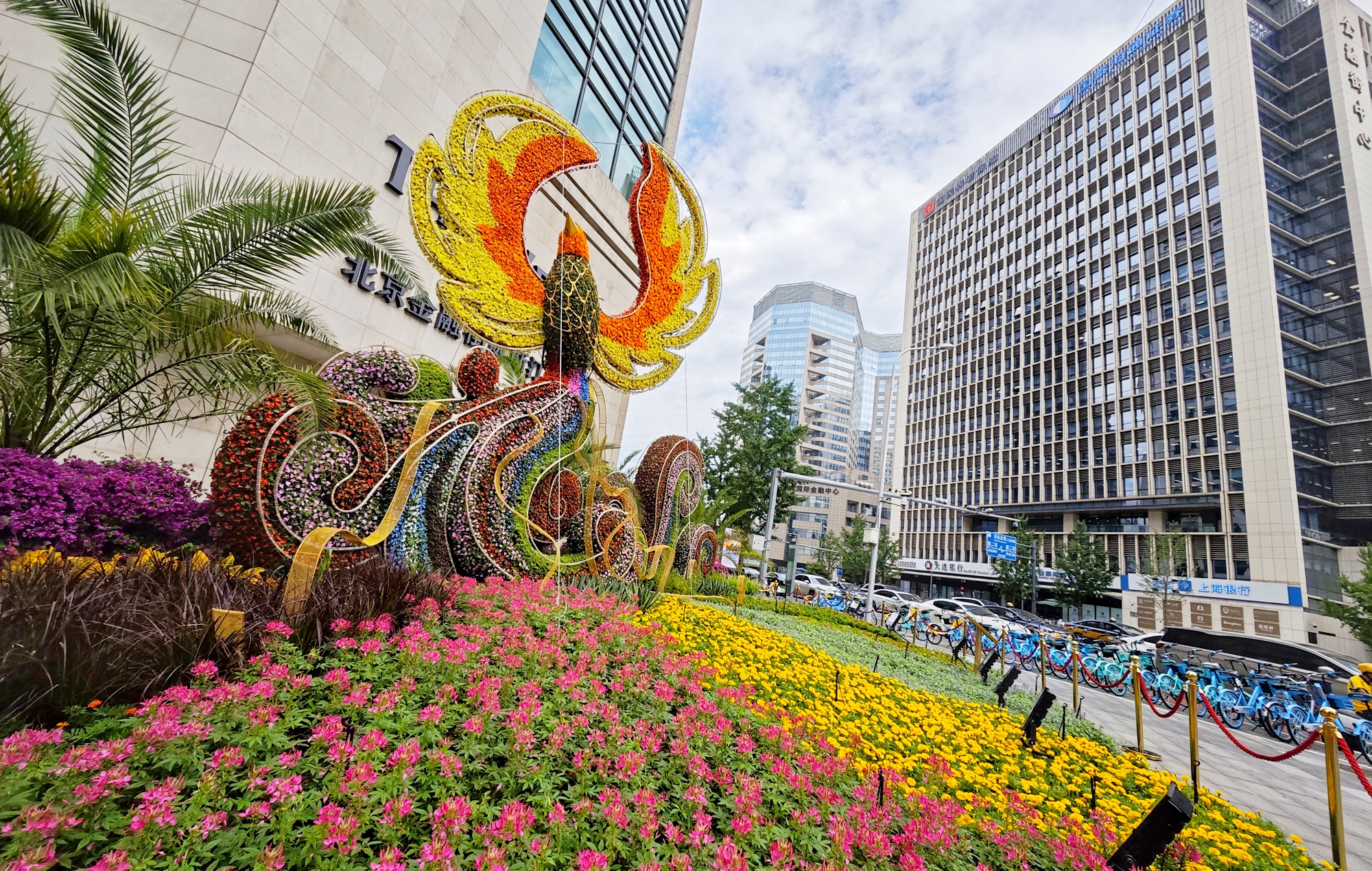 在金融街点位的《金凤呈祥》花坛,以“凤凰涅槃”为核心题材。雕塑中凤凰羽翼舒展,姿态昂扬,仿佛从历史淬炼中振翅而起。