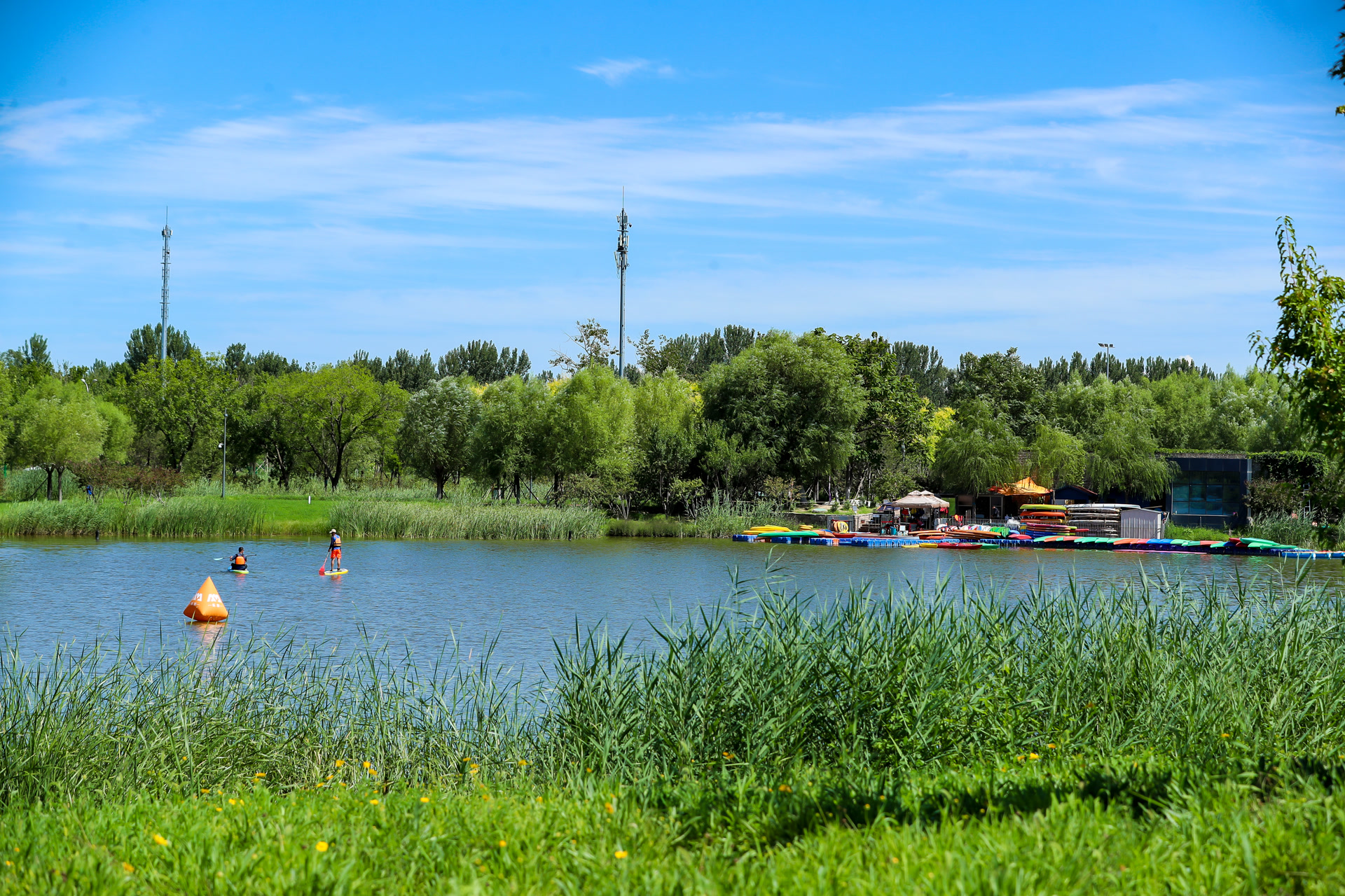 北京温榆河公园朝阳段西园沁湖码头处,沁湖水域可以玩的运动项目十分丰富。除了桨板,还有皮划艇、动力冲浪板、卡丁船、水上小摩托等水上运动项目。