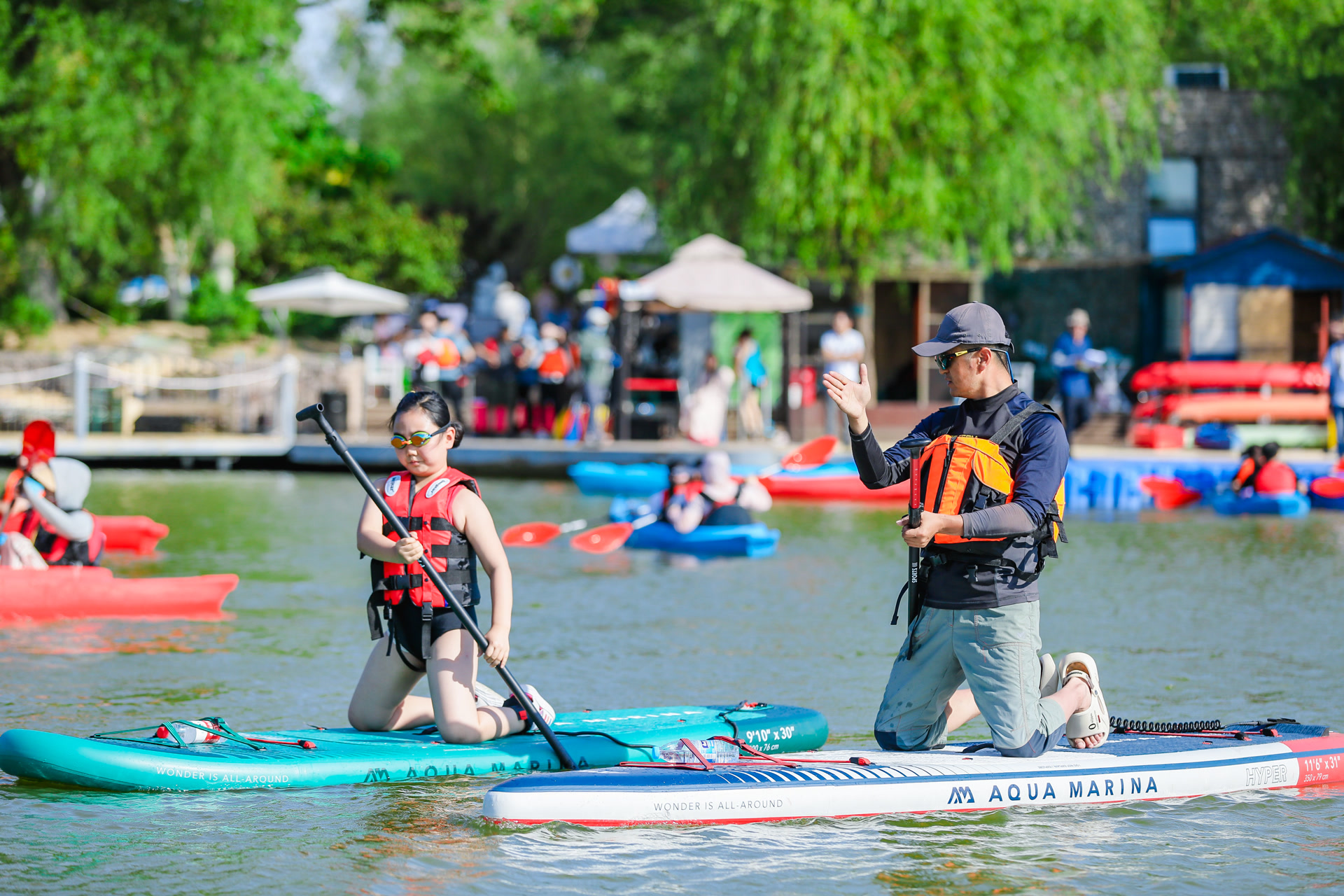 温榆河公园水上运动项目负责人邵靖冉介绍,温榆河公园沁湖水域为人工湖,湖面平静,流速近乎零,满足桨板运动所需的静水环境要求;沁湖水面开阔,水上运动基地运营涉及面积约5万平方米;沁湖水深常年稳定在0.8米至1.4米,没有暗流或浅滩风险。“稍微高一点的小朋友都可以踩到底,安全能得到保证。”