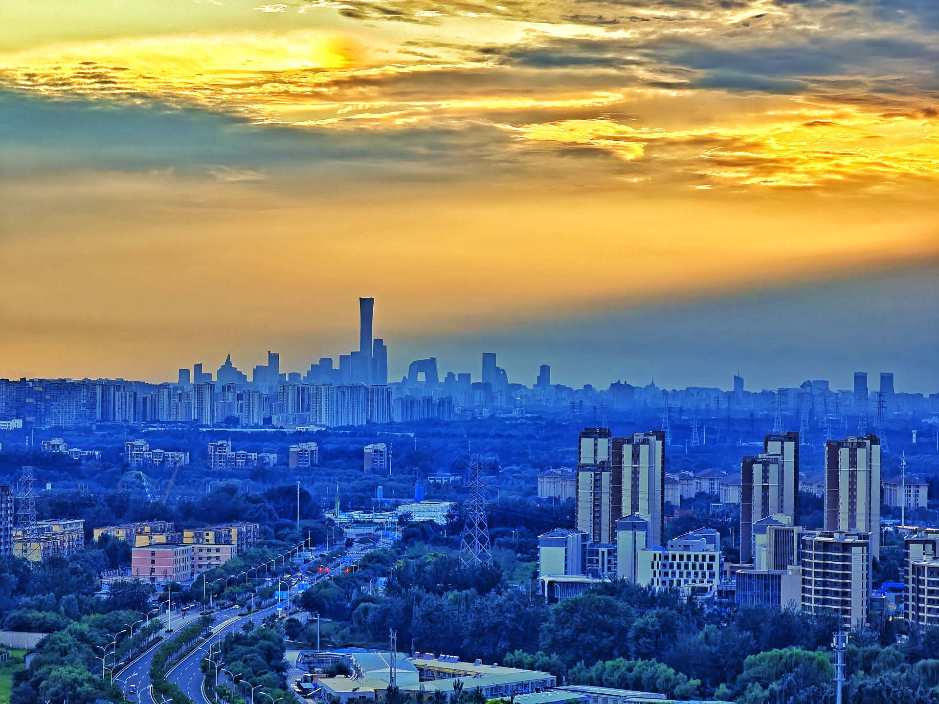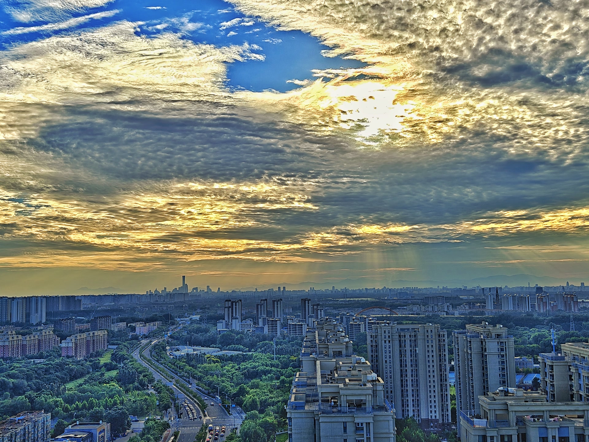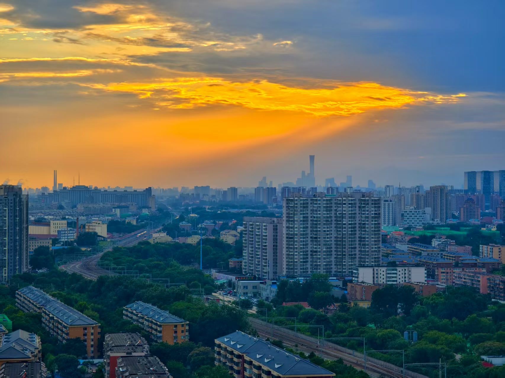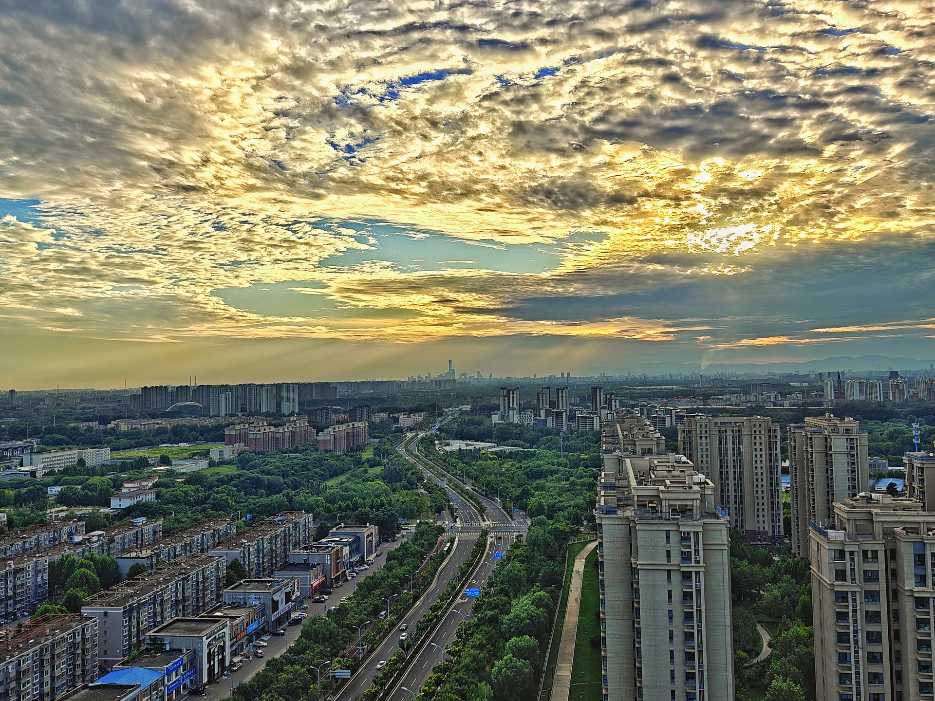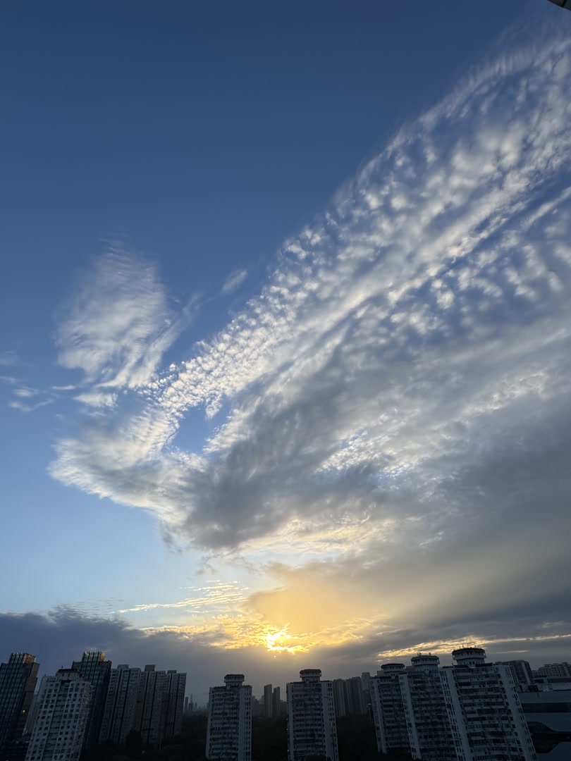 北京傍晚:霞光裁锦缎,云海涌金潮