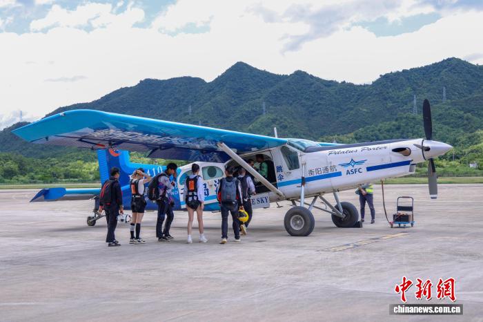 在浙江杭州一处跳伞基地,伴随着引擎的轰鸣,一架小型飞机冲向蓝天。当高度升至4000米,舱门打开几秒钟后,跳伞体验师王家晨带着体验者纵身跃出机舱。