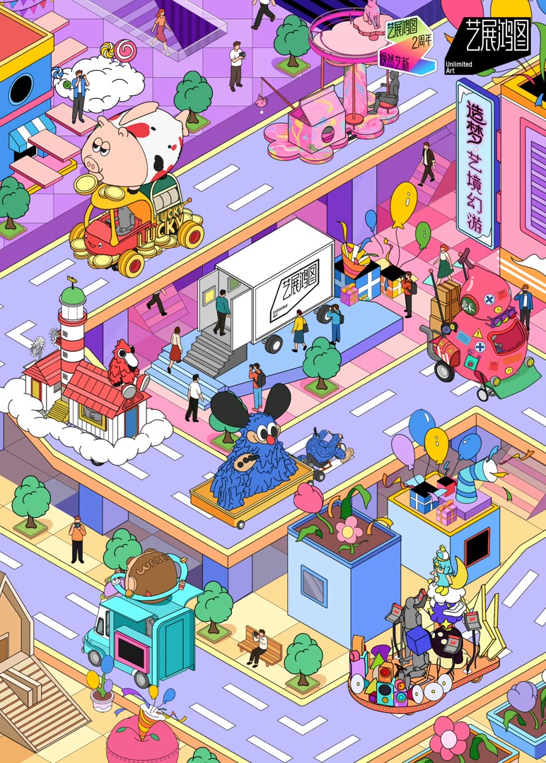 此外,艺展鸿图还公布了全新的“艺术巡游”项目——造梦·艺境幻游。该厂牌旗下7位青年潮流艺术家,共同打造了一组兼具空间流动性、互动性和观赏性的艺术巡游花车。这组巡游花车不仅每一辆都有不同的艺术主题风格,还可以承载艺术展览、艺术品及艺术衍生品销售、餐饮售卖、品牌曝光、互动游戏、K歌、DJ舞台表演等多元功能,堪称“移动的艺术综合体”。据介绍,该巡游花车8月底将在2025阿那亚·虾米音乐节首秀,未来也将面向其他音乐节、文旅景区、商业地产等不同消费场景开放合作。