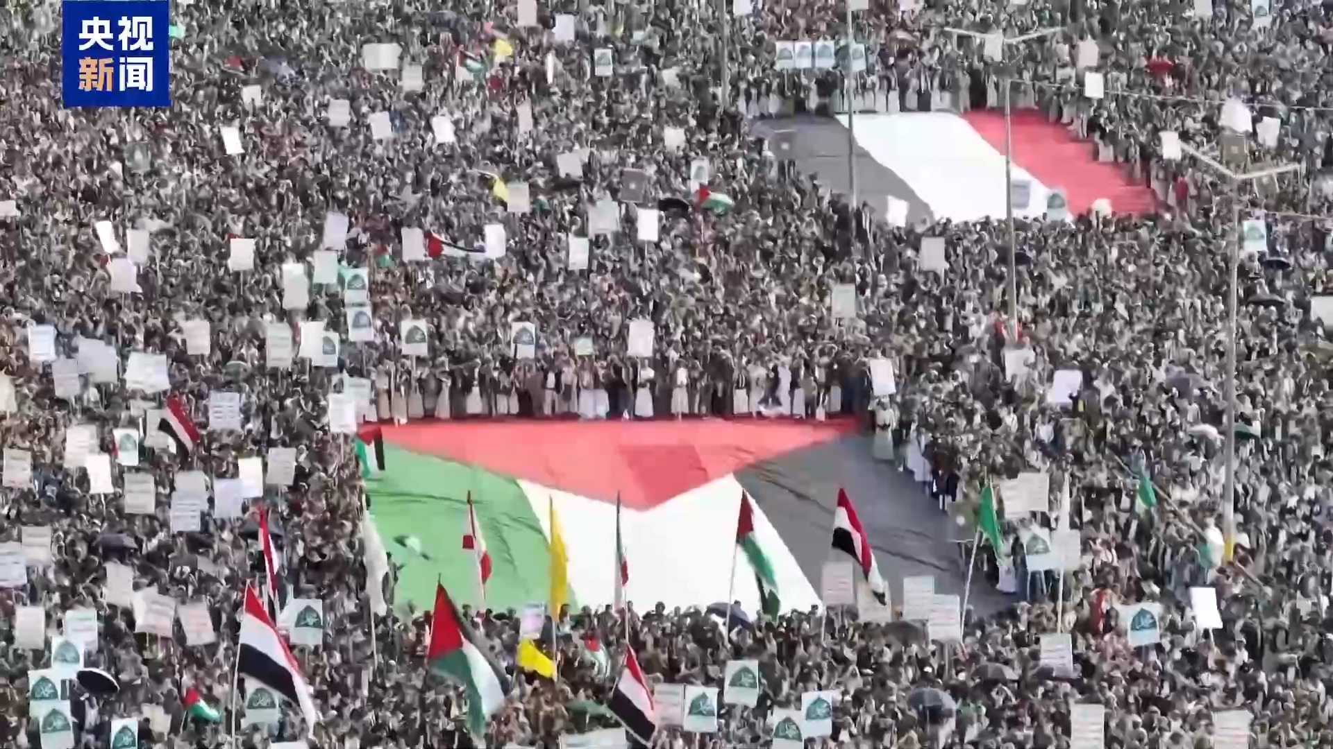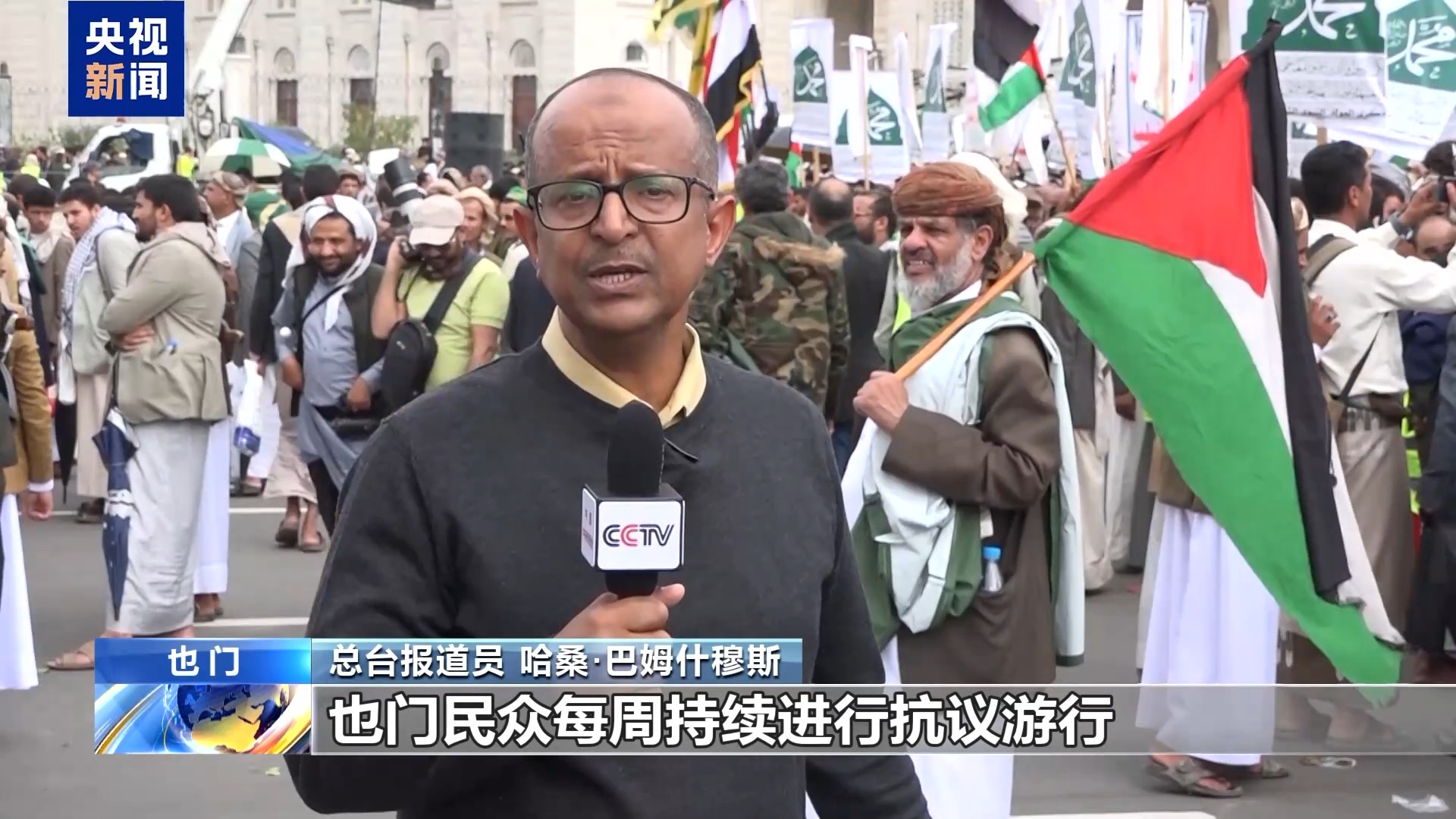总台报道员 哈桑·巴姆什穆斯:伴随以色列政府坚持出台更多关于占领加沙地带扩大战争的决定,在萨那南部的广场,也门民众每周持续进行抗议游行谴责以方的决定,并抗议加沙地带正在发生的杀戮。