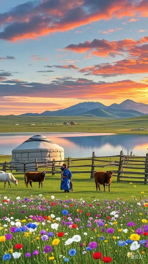 停下车,两个人躺在毛绒绒的草地上。万绿之中,红红的萨日朗花开了,远山、小河、 旷野都印染上了一片片霞光,顿然有种如梦如幻的意象。想起八岁那年,我来到科尔沁草原,踏着没膝的草浪蹦跳,在溢香的野花中嬉戏,晚霞余晖落在稚嫩的脸上,并无视野之外的惊喜,只有一种新奇的童趣。玩累了就坐在绿野上,看着天边飘动的彩霞,数着眼前走过的雪白的羊,一头,两头,三头……足足有二十六头之多。我惊异地发现有五头还长着白胡子。它们不紧不慢地晃到不远处的小河边饮水。羊群后边跟着挥着羊鞭,穿蒙古袍的老爷爷,用带着浓浓草原味道的汉语问我,怎么会在这里?我告诉他,带我来的叔叔在那边洗车呢。牧羊爷爷冲小河那边瞧了瞧,笑了:“那人我认识,是香山农场开吉普的司机。哎,我怎么没见过你呢,城里来的孩子?”