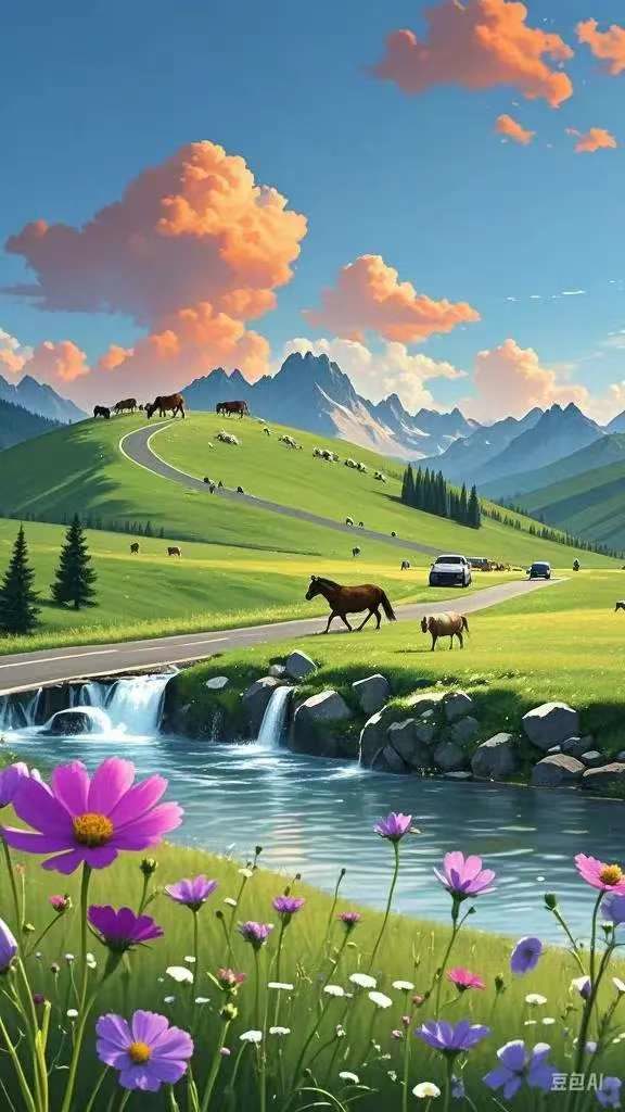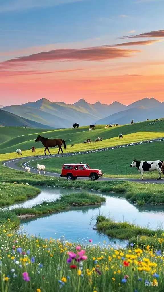 那天,朋友望着远山下的绿野告诉我,那首歌词就是依托这片草原写就的。他当时恰逢人生低谷,一日独坐草地上,有条小河在身边悄悄流过。他迎着晚霞,在不经意间,创作的灵感上头了,灵气仿佛化作一条小河,流出了一串霞光浸润的诗行。他顿时抛却烦恼,宠辱皆忘,歌词便出现了如斯句子:“不要说道路坎坎坷坷,酸甜苦辣都是歌。”