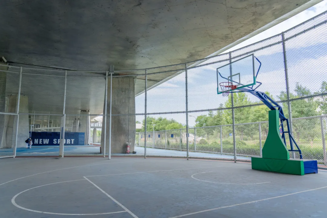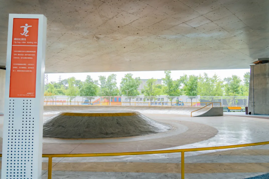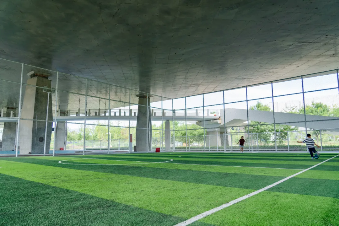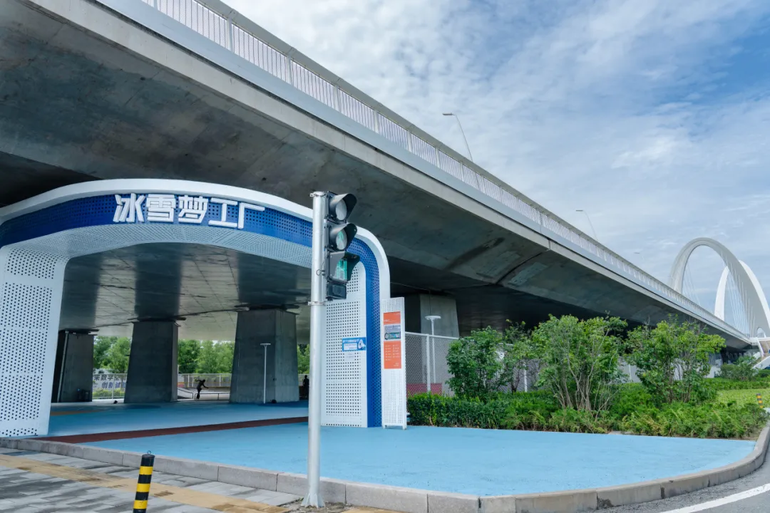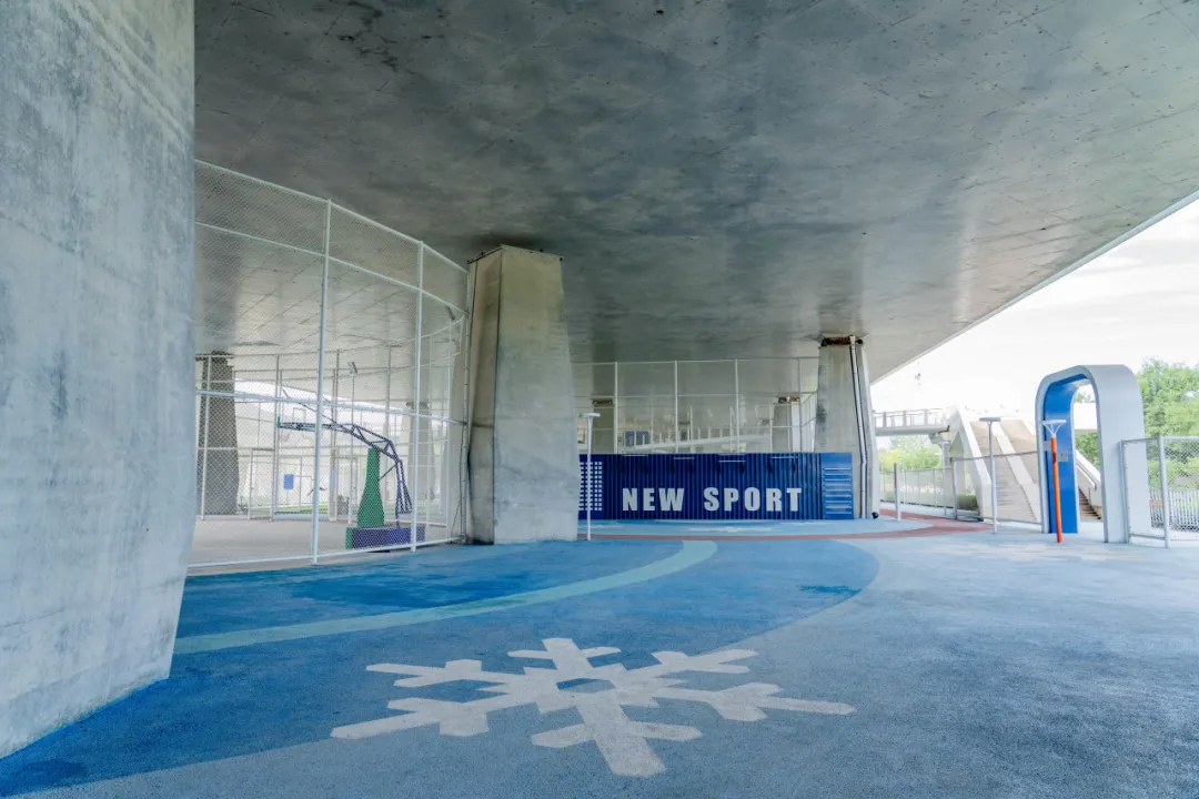 桥下空间由西至东主要由“冰雪梦工厂”“驿站”“雪花乐园”三个区域构成,分别主要承担球类运动空间、休息驿站、健身运动等功能。