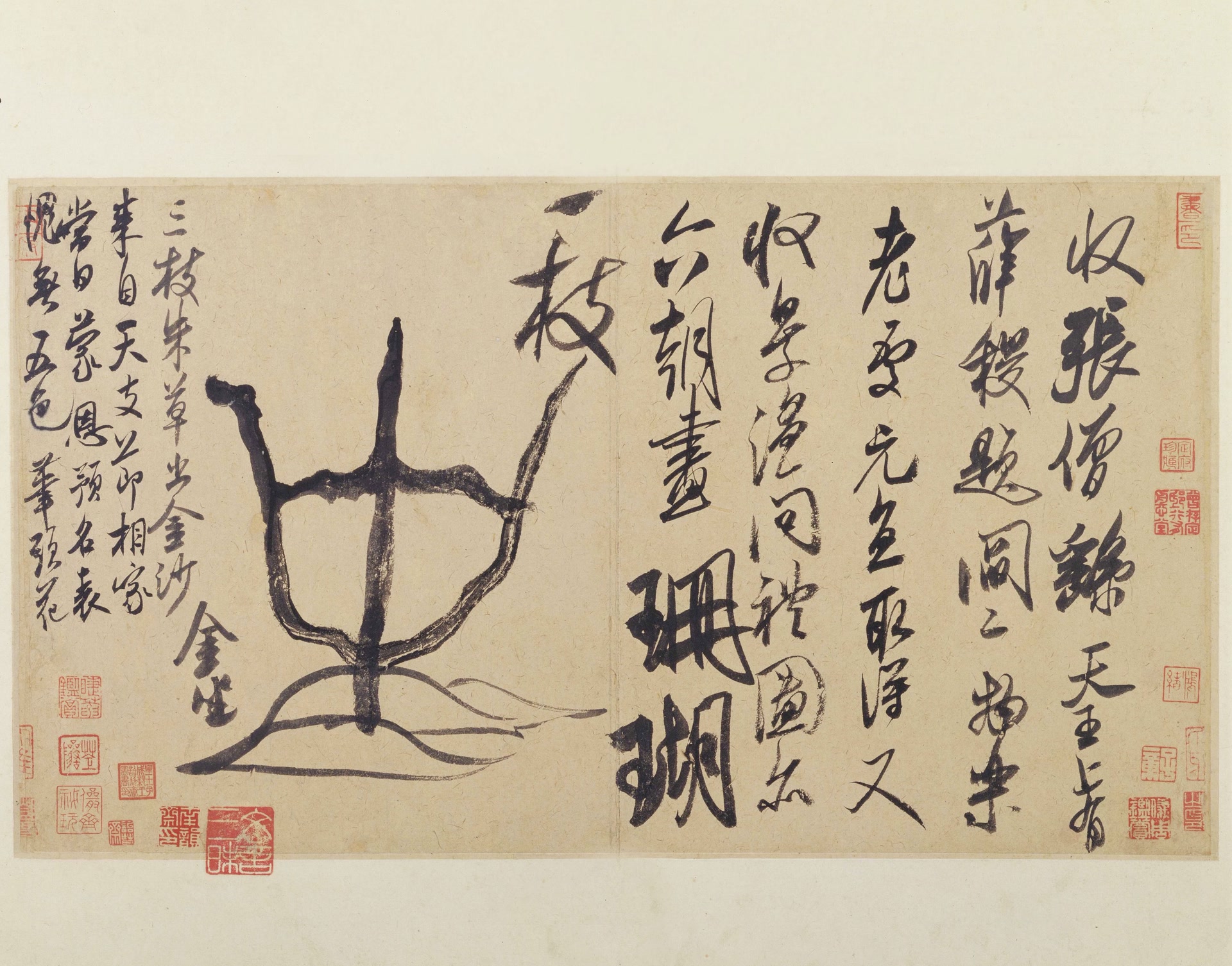 快雪堂本虽失锋芒之利,但其结体之敧侧、章法之跌宕,仍然足以传递米芾开张纵逸之气。如“张僧”二字、“上有薛稷题”中的“题”字、“又收”中的“收”字、“珊瑚一枝”中的“枝”字等,都将米芾倾斜的体势体现得淋漓尽致,险峻灵动。特别是第五列最后二字,“珊瑚”二字,大而重,字形兀然变大,厚重耀眼,当可视为作品的点睛之笔,最后二字,“一”字最高,字形奇异,似儿童涂鸦,天真童趣自然。“粗重点”与“虚弱点”此起彼伏,错落悠然。