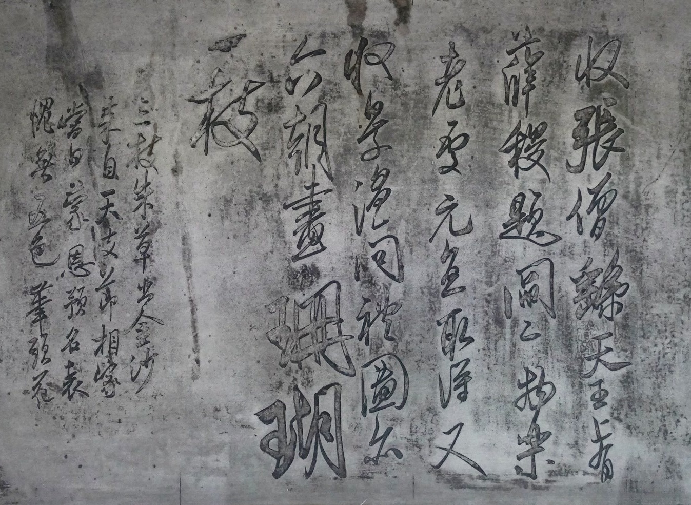 北海快雪堂西廊镌刻着米芾《珊瑚帖》。珊瑚帖墨迹本作品分为左右两部分,中间画有一支珊瑚笔架,快雪堂本珊瑚帖则只保留了文字部分,在上石时,将米芾所画的一枝珊瑚去掉未刻。相较于墨迹本竹纸上笔走龙蛇的即时鲜活,快雪堂本则为我们提供了另一种“凝固的狂放”。