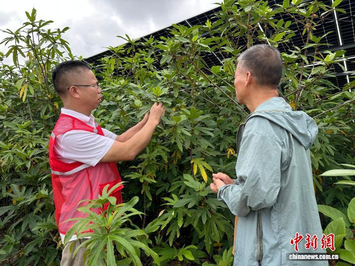 烈日下,光伏板下温润小气候让五指毛桃长得格外舒展。阳光被“折叠”利用,荒坡石砾地成了宝地。