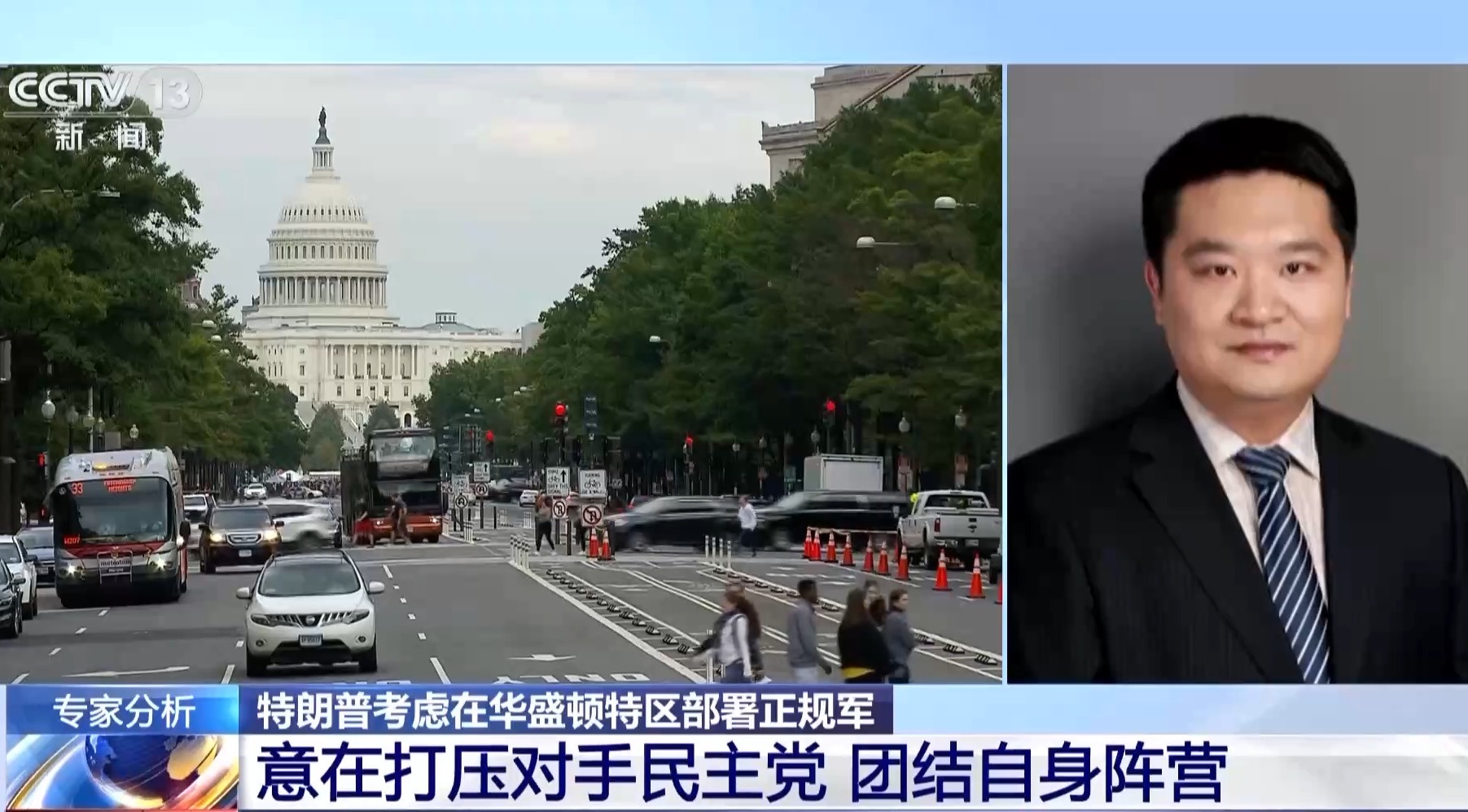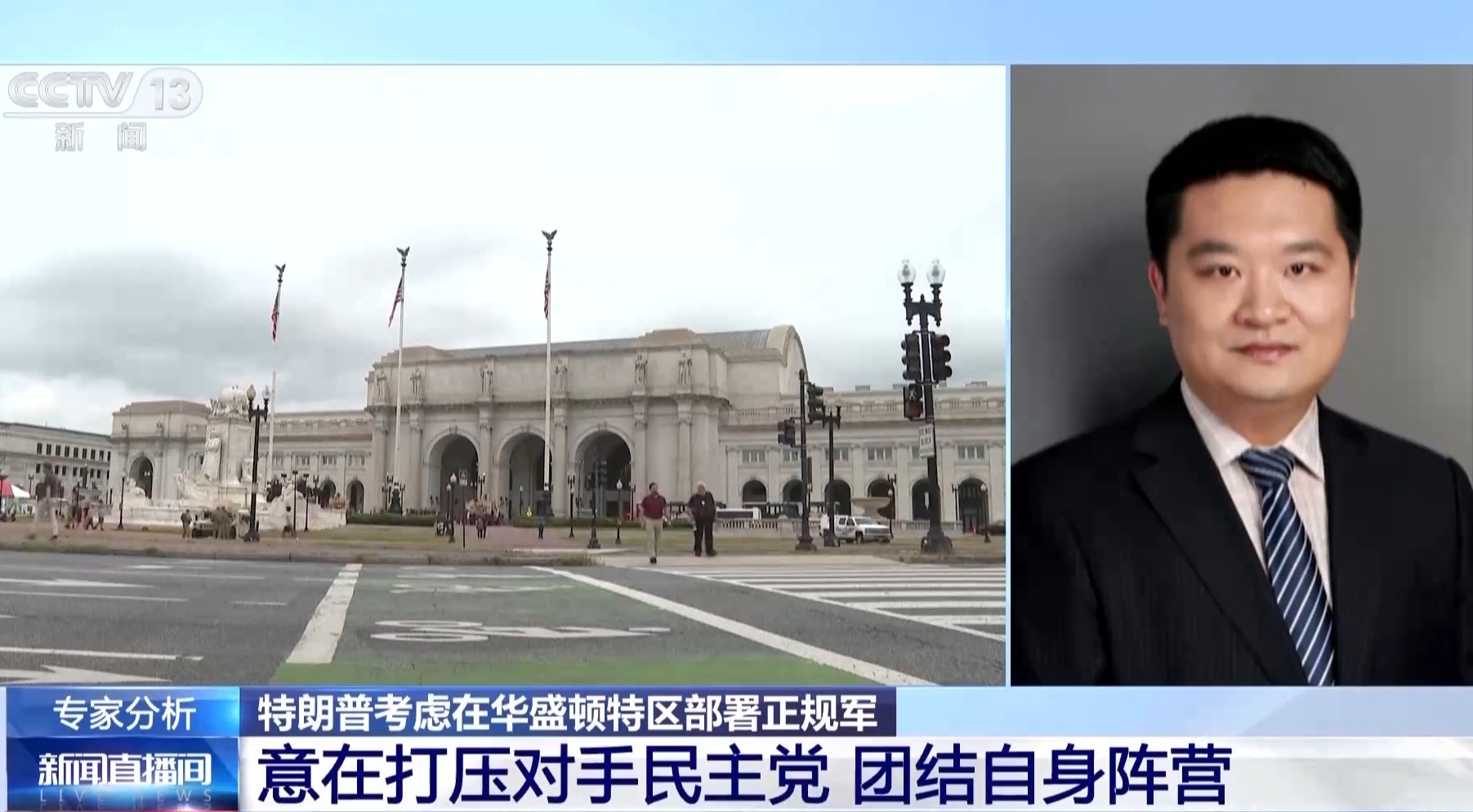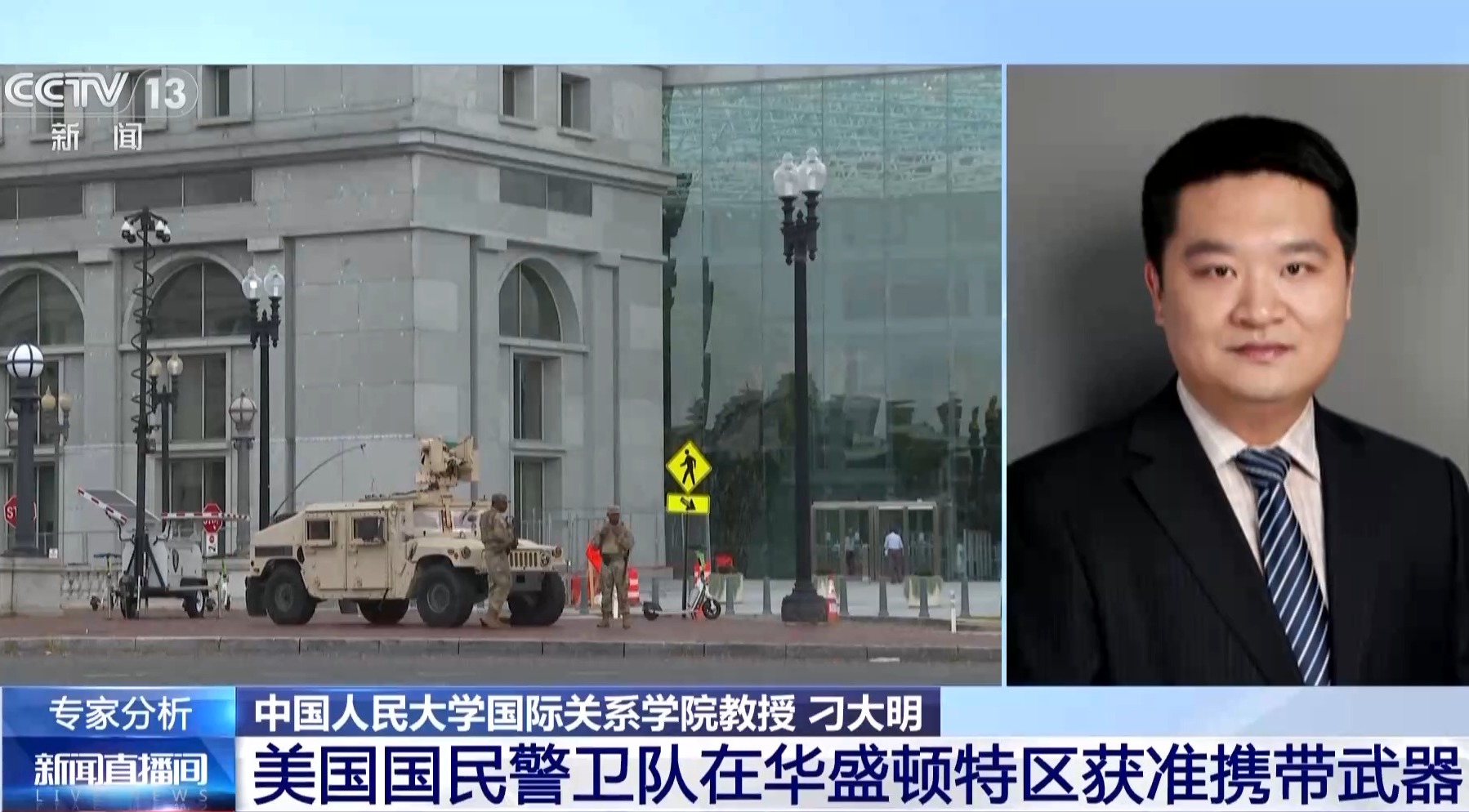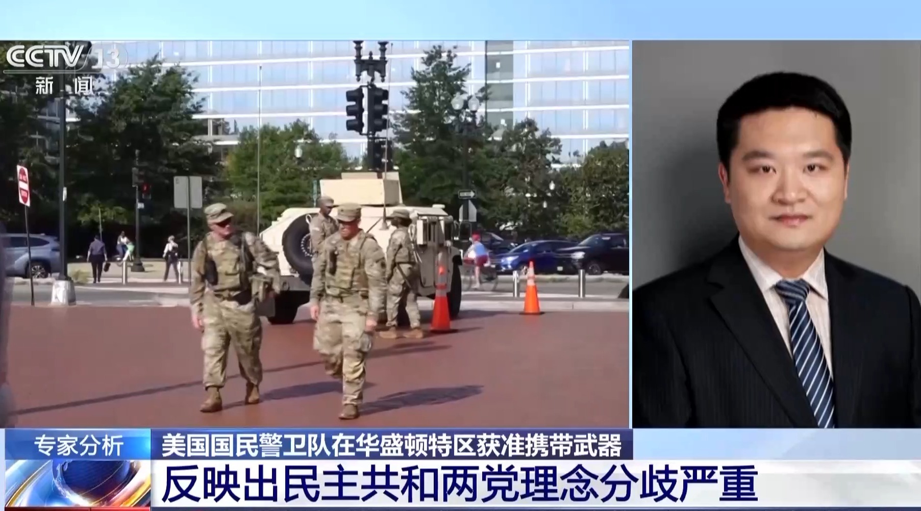 中国人民大学国际关系学院教授 刁大明:特朗普政府向华盛顿特区派遣国民警卫队,并派出持枪的执法人员巡逻,从而客观上接管了华盛顿特区执法管辖权的做法,应该说存在着比较明显的党争色彩。