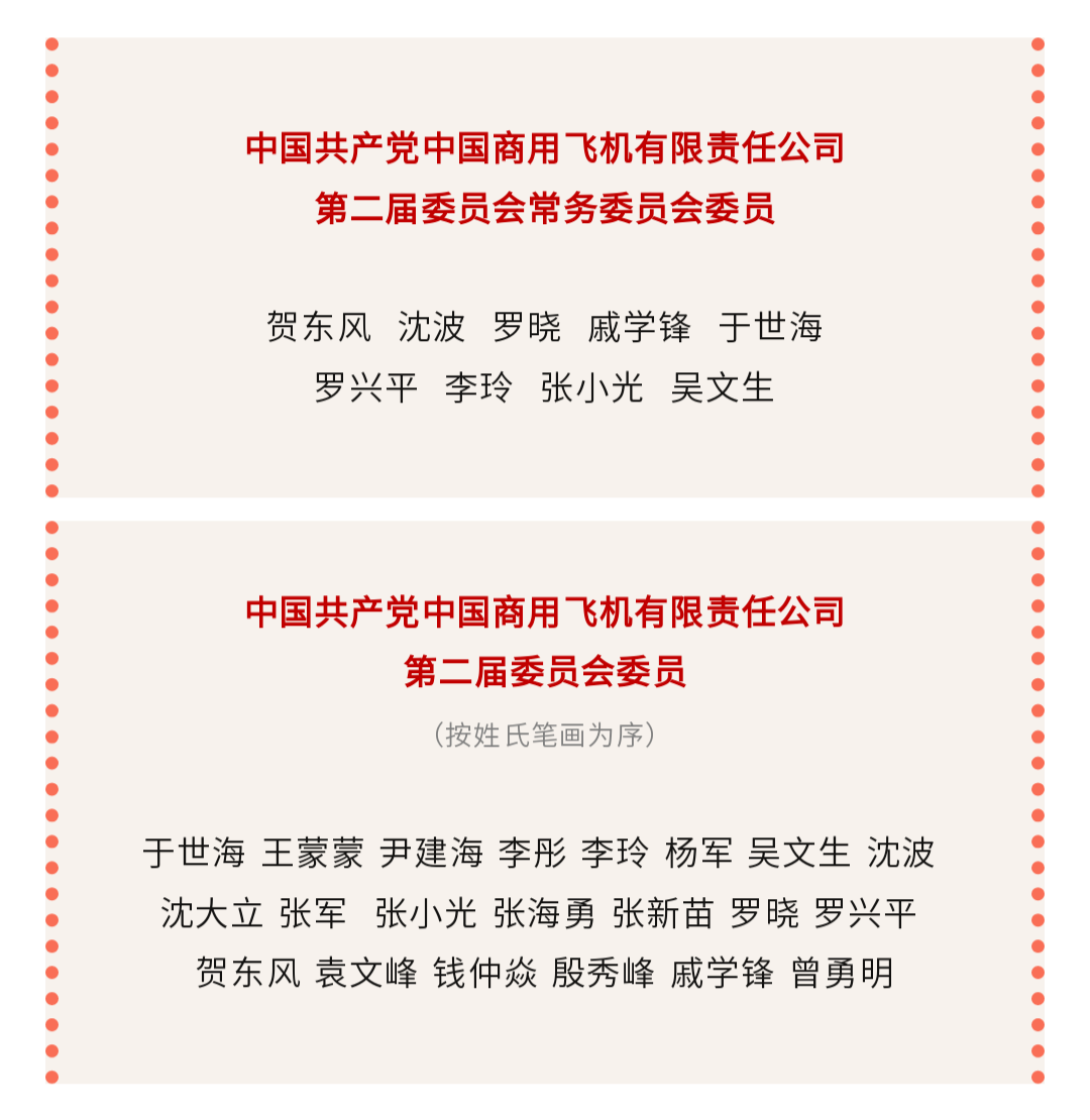 闭幕会后召开新一届党委第一次全体会议。会议选举贺东风、沈波、罗晓、戚学锋、于世海、罗兴平、李玲、张小光、吴文生为中国共产党中国商飞公司第二届委员会常务委员会委员,选举贺东风为中国共产党中国商飞公司第二届委员会书记,选举沈波、罗晓为中国共产党中国商飞公司第二届委员会副书记。中管企业党委换届督导组到会指导。