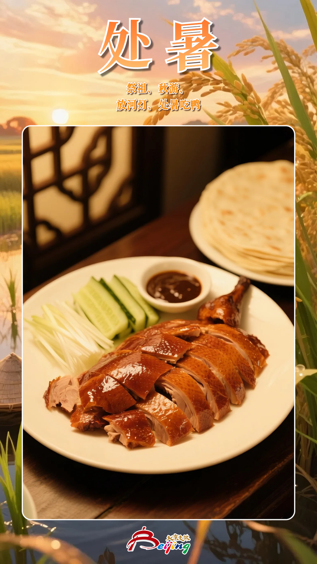 民间有处暑吃鸭子的习俗,其因是老鸭味甘性凉。其做法也花样繁多,有白切鸭、柠檬鸭、子姜鸭、烤鸭、荷叶鸭、核桃鸭等。北京至今还保留着这一习俗,通常处暑当日,北京人就会买处暑百合鸭等。