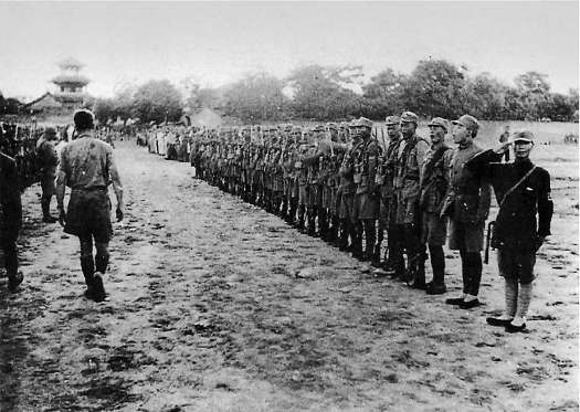 戴德华(林迈可的同事)与列队欢迎的八路军部队。(1938年)
