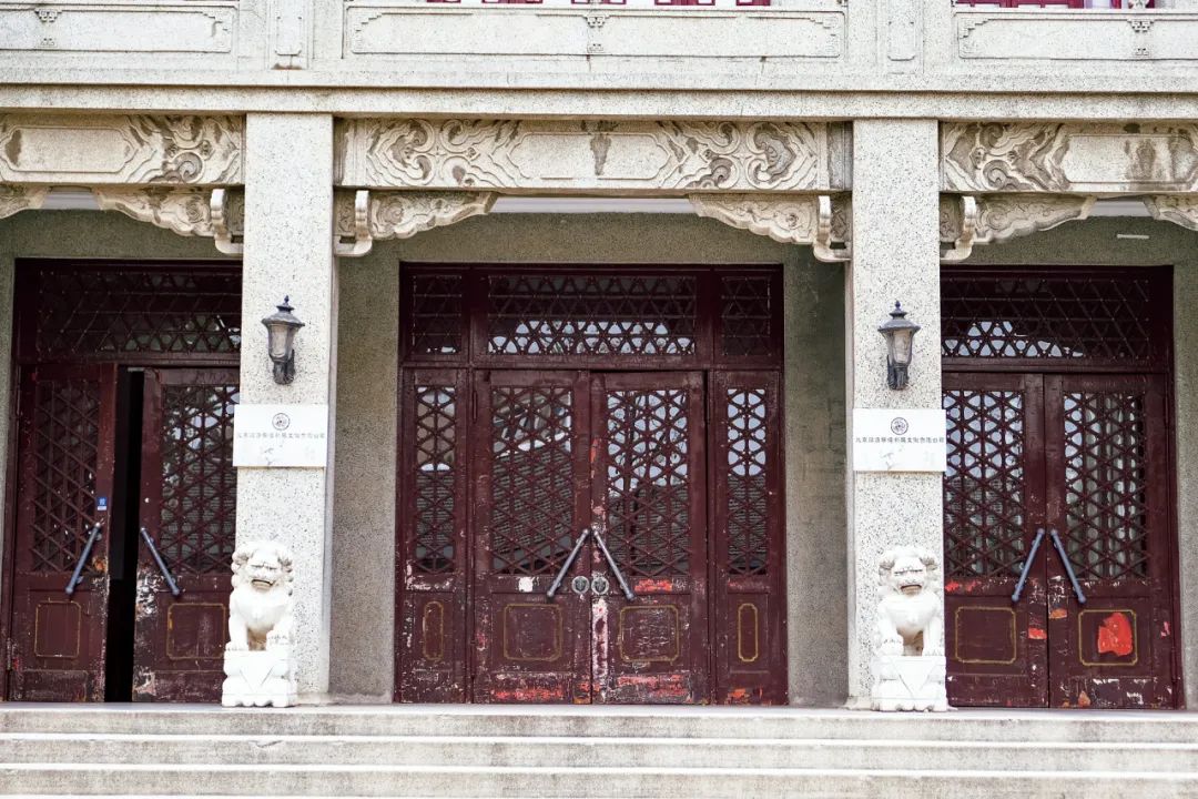 大礼堂平面呈“工”字形布局,东西走向,入口位于西侧,中部为礼堂,人字坡顶,砖混结构;南北两侧有单层平顶的办公管理用房相连。立面清水砖墙,仿中式悬山样式,山花面有木制漆红博风板,混凝土脊。西侧的入口大门为弹簧合页木门,中式三交六椀菱花心屉,较为精美。二层开三孔拱券门洞,中间大、两侧小,水刷石饰面门套,有雕花。西侧入口砖墙外有一混凝土水刷石饰面的前廊,并作为二层露台。前廊由方柱支撑,混凝土梁外面仿额枋,上有如意雕花,梁下饰混凝土雀替,二层为混凝土水刷石饰面并设中式栏杆。两侧的管理用房凸出于入口,形成引导空间。下部为水刷石仿中式须弥座台阶,墙面中间有海棠方窗,布瓦墙帽,檐下石椽,仿冰盘檐。