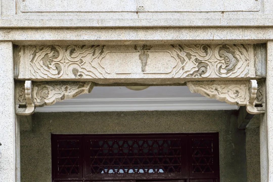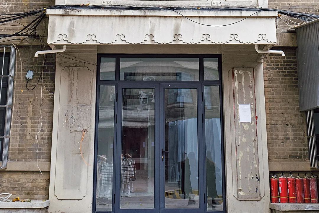 门楼平面呈“一”字形布局,建筑东西走向,入口面北,仿中式悬山建筑,砖混结构,山墙面上可见混凝土脊。立面清水砖墙,入口以混凝土方柱分隔出3个门洞,混凝土梁上有仿额枋——如意雕花额枋,梁下饰混凝土雀替。入口3个门洞的南侧为3扇红漆铁门,部分镂空,有中式窗棂传统纹样,大门整体庄重大气。入口两侧是门卫房,下部为水刷石面的仿中式须弥座墙裙,中间为清水灰砖墙面,上有海棠方窗、葵式套方的混凝土窗棂。门卫房为褐色木门窗,门上有装饰图案。