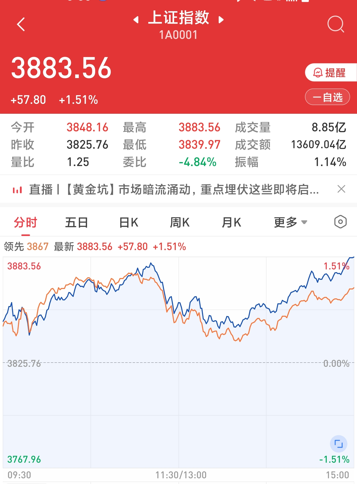 截至收盘,上证指数放量大涨1.51%,报3883.56点;深指涨2.26%;创业板指涨3%。此外,北证50涨幅为0.23%,科创50飙涨3.2%。