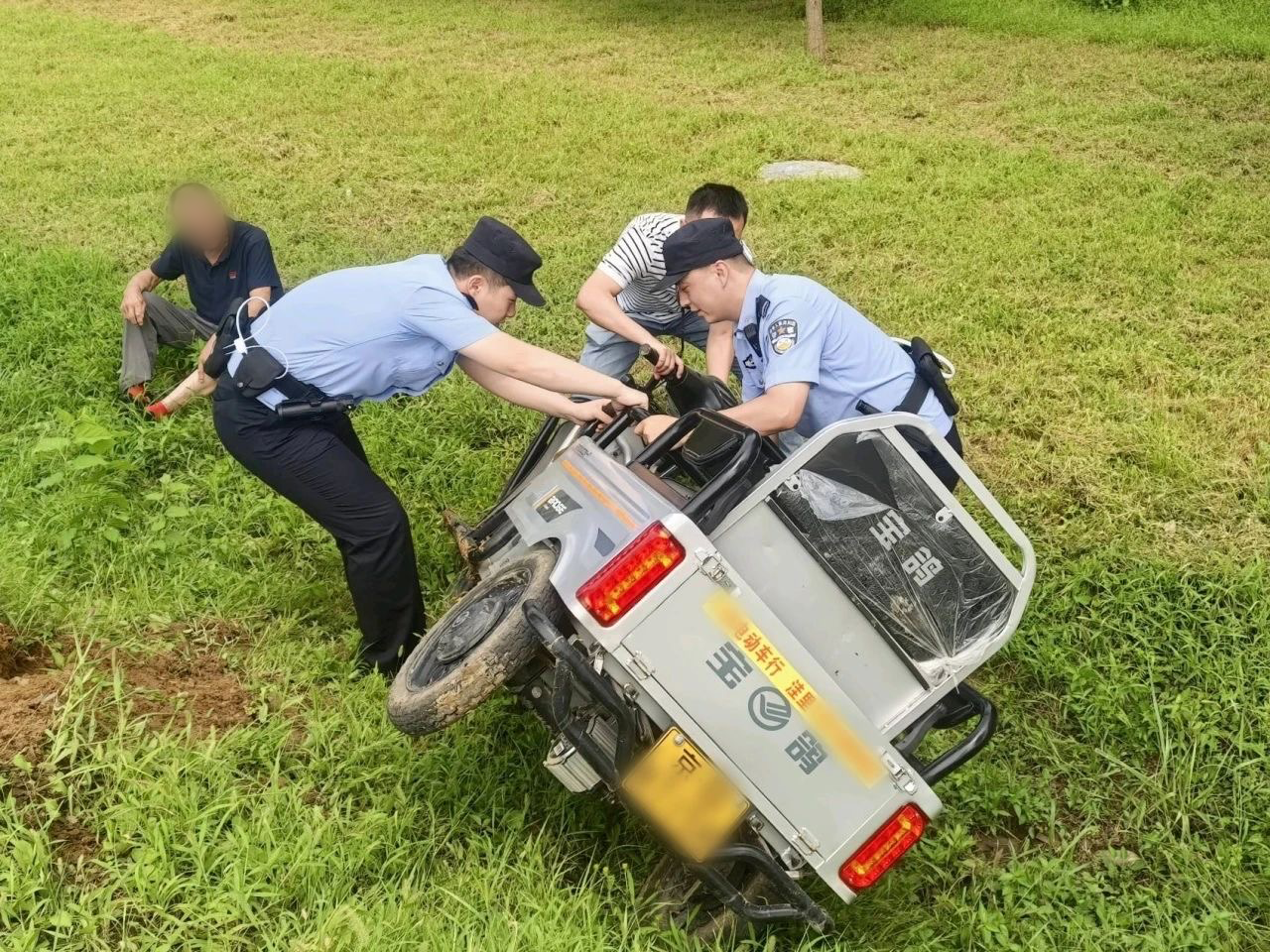 当日上午10时左右,王咏吉法官团队工作完沿白马路返回执行局途中,偶遇一起交通事故,一辆电动三轮车侧翻在路边一米多深的低矮草丛中,其中一位老人瘫坐在草丛上,腿部有明显擦伤,另一位老人头部撞到地面,有些许不适。