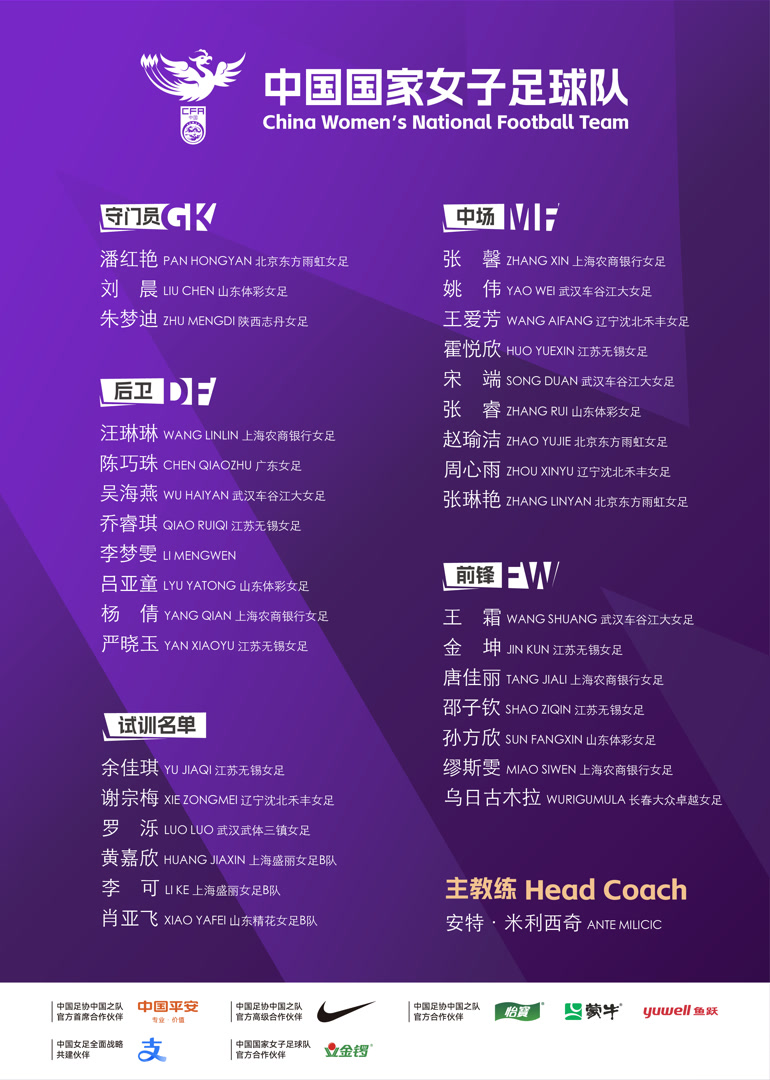 此外,本次集训主教练米利西奇及教练团队还征召了余佳琪、谢宗梅、罗泺、黄嘉欣、李可、肖亚飞作为试训球员。