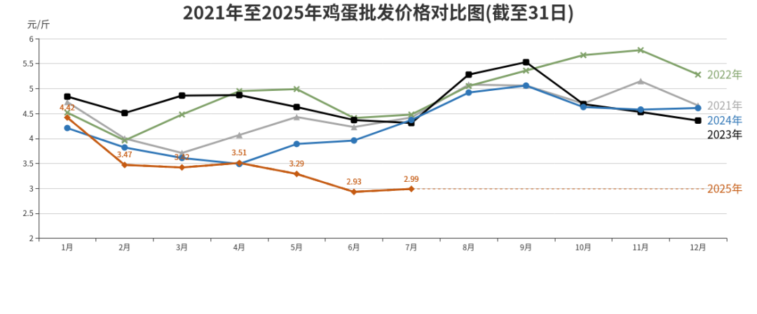 鸡蛋批发、农贸、超市价格分别为每斤2.99元、3.9元、4.53元,环比分别为上涨2.05%、下降4.41%、下降2.16%,同比分别下降31.58%、20.73%、13.05%。