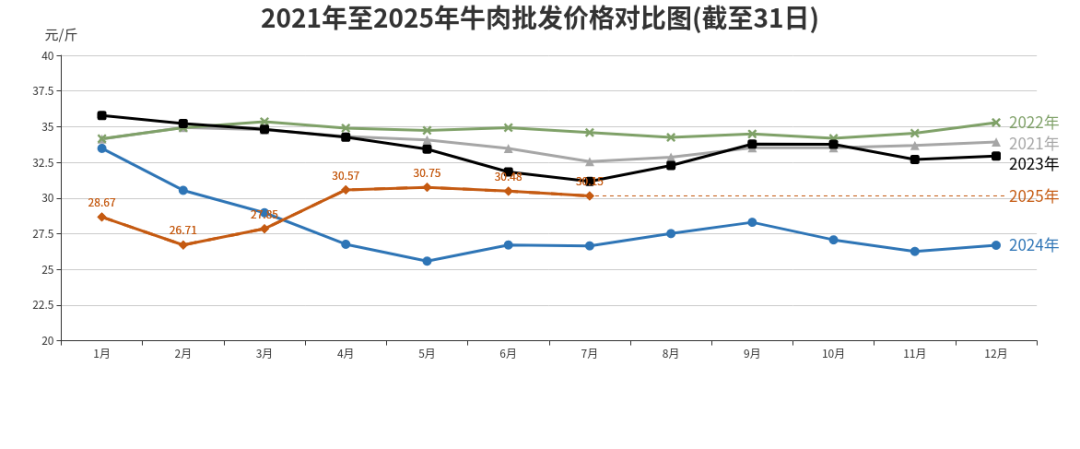 牛肉批发、农贸、超市价格分别为每斤30.15元、33.28元、40.91元,环比分别下降1.08%、下降0.24%、上涨0.94%,同比分别上涨13.13%、下降0.06%、上涨3.94%。