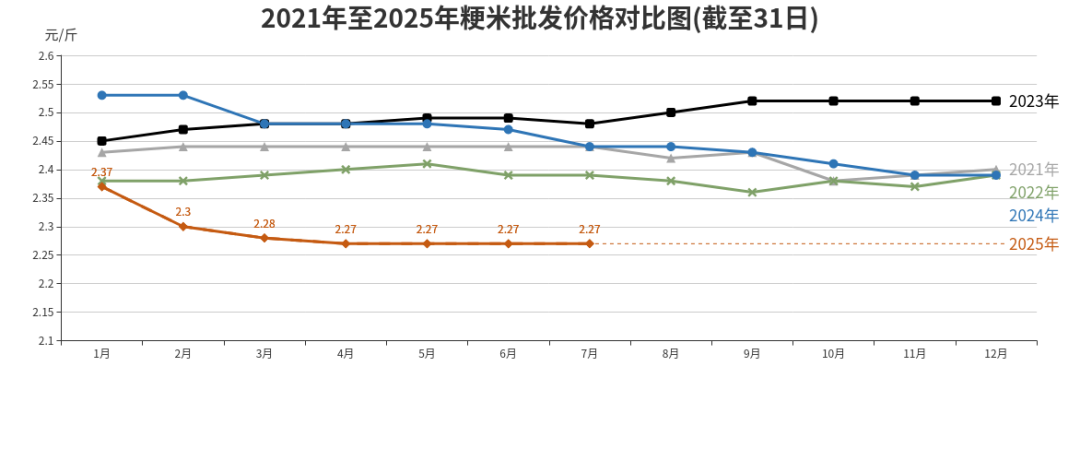 粳米批发、农贸、超市价格分别为每斤2.27元、3.11元、2.89元,环比分别持平、持平、下降0.34%,同比分别下降6.97%、上涨1.97%、持平。