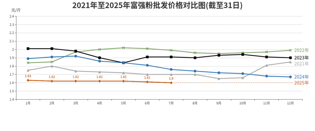 富强粉批发、农贸、超市分别为每斤1.6元、2.23元、2.26元,环比分别下降0.62%、下降0.45%、持平,同比分别下降9.09%、下降3.46%、下降5.83%。
