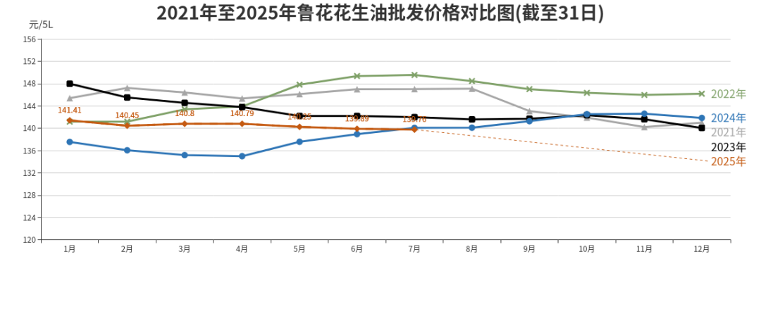“鲁花”花生油批发、农贸、超市价格分别为每桶139.76元、150.28元、160.92元,环比分别下降0.09%、0.02%、0.02%,同比分别下降0.21%、上涨0.35%、上涨1.39%。