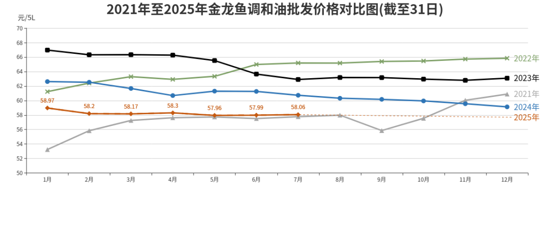 “金龙鱼”调和油批发、农贸、超市价格分别为每桶58.06元、65.77元、71.88元,环比分别上涨0.12%、下降0.92%、下降0.39%,同比分别下降4.4%、2.55%、4.74%。