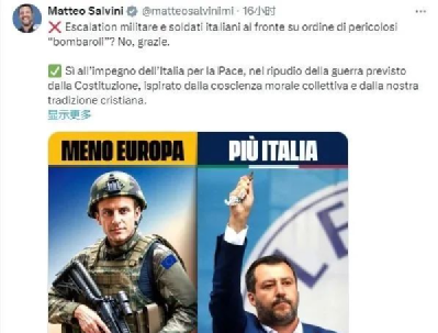 萨尔维尼的意思很明确:意大利不会追随法国派兵去乌克兰,即使马克龙派兵去乌克兰法国人也不会追随。